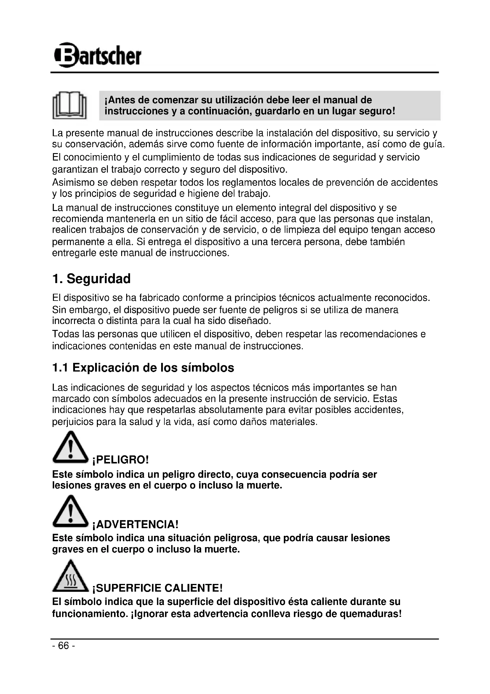 ¡Antes de comenzar su utilización debe leer el manual de instrucciones y a continuación, guardarlo en un lugar seguro! La presente manual de instrucciones describe la instalación del dispositivo, su servicio y su conservación, además sirve como fuente de información importante, así como de guía. El conocimiento y el cumplimiento de todas sus indicaciones de seguridad y servicio garantizan el trabajo correcto y seguro del dispositivo. Asimismo se deben respetar todos los reglamentos locales de prevención de accidentes y los principios de seguridad e higiene del trabajo. La manual de instrucciones constituye un elemento integral del dispositivo y se recomienda mantenerla en un sitio de fácil acceso, para que las personas que instalan, realicen trabajos de conservación y de servicio, o de limpieza del equipo tengan acceso permanente a ella. Si entrega el dispositivo a una tercera persona, debe también entregarle este manual de instrucciones.