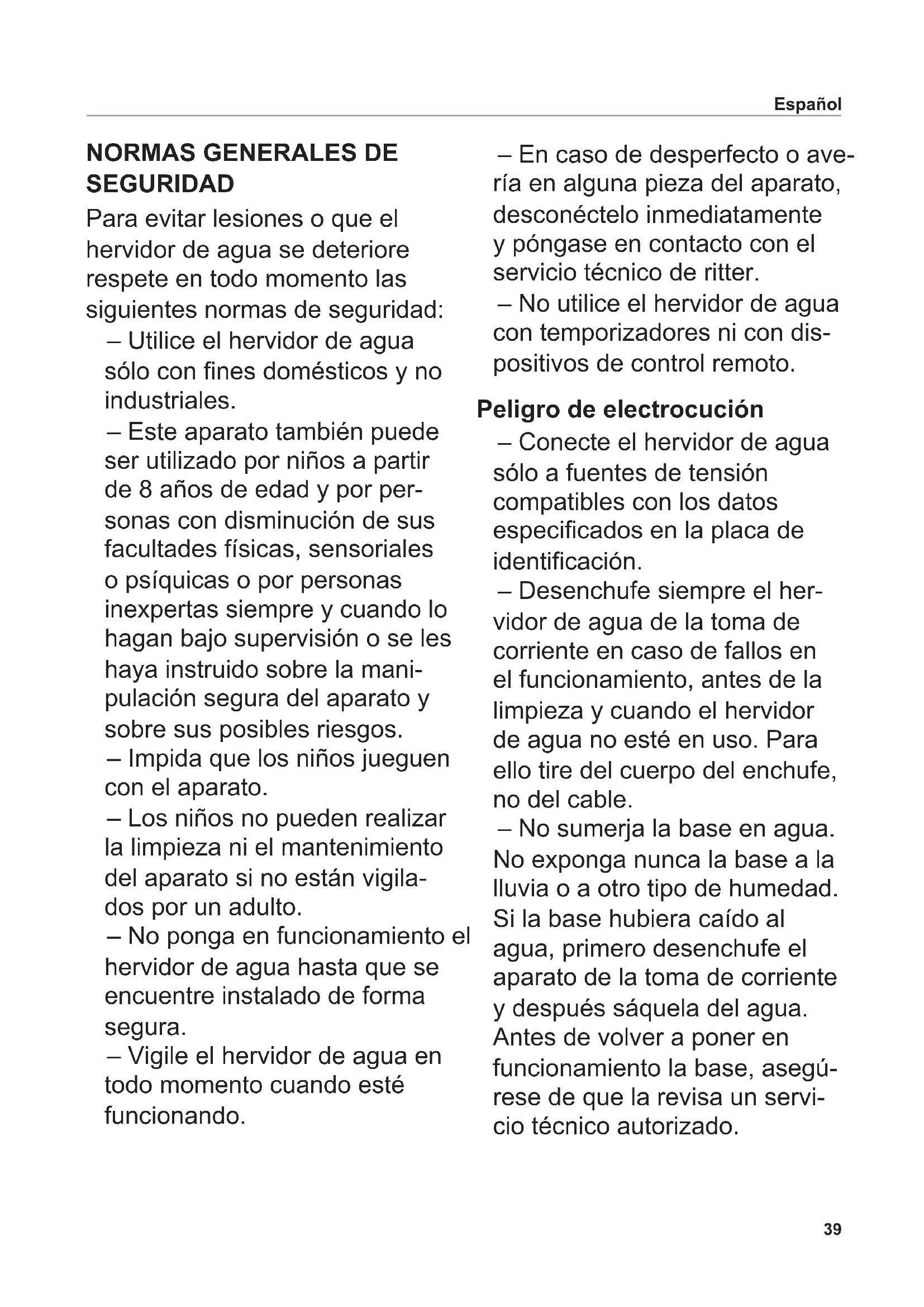 SEGURIDAD Para evitar lesiones o que el hervidor de agua se deteriore respete en todo momento las siguientes normas de seguridad: – Utilice el hervidor de agua sólo con nes domésticos y no industriales. – Este aparato también puede ser utilizado por niños a partir de 8 años de edad y por per- sonas con disminución de sus facultades físicas, sensoriales o psíquicas o por personas inexpertas siempre y cuando lo hagan bajo supervisión o se les haya instruido sobre la mani- pulación segura del aparato y sobre sus posibles riesgos. – Impida que los niños jueguen con el aparato. – Los niños no pueden realizar la limpieza ni el mantenimiento del aparato si no están vigila- dos por un adulto. – No ponga en funcionamiento el hervidor de agua hasta que se encuentre instalado de forma segura. – Vigile el hervidor de agua en todo momento cuando esté funcionando. – En caso de desperfecto o ave- ría en alguna pieza del aparato, desconéctelo inmediatamente y póngase en contacto con el servicio técnico de ritter. – No utilice el hervidor de agua con temporizadores ni con dis- positivos de control remoto. Peligro de electrocución – Conecte el hervidor de agua sólo a fuentes de tensión compatibles con los datos especicados en la placa de identicación. – Desenchufe siempre el her- vidor de agua de la toma de corriente en caso de fallos en el funcionamiento, antes de la limpieza y cuando el hervidor de agua no esté en uso. Para ello tire del cuerpo del enchufe, no del cable. – No sumerja la base en agua. No exponga nunca la base a la lluvia o a otro tipo de humedad. Si la base hubiera caído al agua, primero desenchufe el aparato de la toma de corriente y después sáquela del agua. Antes de volver a poner en funcionamiento la base, asegú- rese de que la revisa un servi- cio técnico autorizado.40 Español – No toque la base con las manos húmedas. Si la base está húmeda o se ha mojado, o si se encuentra sobre una supercie húmeda, no se puede utilizar el hervidor de agua. No utilice el hervidor de agua al aire libre. – Seque inmediatamente el agua derramada y el agua de con- densación. Antes de hacerlo desenchufe siempre el aparato. – No llene nunca la jarra cuando ésta se encuentre en la base para evitar el riesgo de des- carga eléctrica por el agua derramada. – Utilice el hervidor de agua solo si el cable de red, la base y la jarra se encuentran en perfecto estado y no presentan signos de deterioro. Si el cable de red está dañado deberá reempla- zarlo el fabricante, su servicio técnico o personas cualicadas para evitar riesgos. – No introduzca nunca objetos metálicos en la base. – Utilice el hervidor de agua exclusivamente con su base (modelo fontana