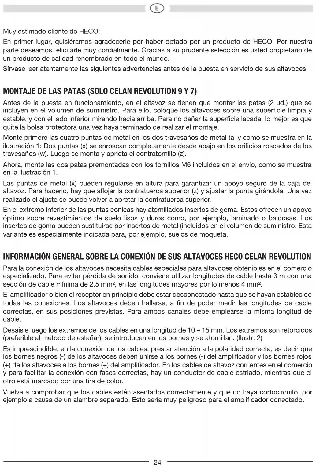 Muy estimado cliente de HECO: En primer lugar, quisiéramos agradecerle por haber optado por un producto de HECO. Por nuestra parte deseamos felicitarle muy cordialmente. Gracias a su prudente selección es usted propietario de un producto de calidad renombrado en todo el mundo. Sírvase leer atentamente las siguientes advertencias antes de la puesta en servicio de sus altavoces. MONTAJE DE LAS PATAS (SOLO CELANREVOLUTION 9 Y 7) Antes de la puesta en funcionamiento, en el altavoz se tienen que montar las patas (2 ud.) que se incluyen en el volumen de suministro. Para ello, coloque los altavoces sobre una supercie limpia y estable, y con el lado inferior mirando hacia arriba. Para no dañar la supercie lacada, lo mejor es que quite la bolsa protectora una vez haya terminado de realizar el montaje. Monte primero las cuatro puntas de metal en los dos travesaños de metal tal y como se muestra en la ilustración 1: Dos puntas (x) se enroscan completamente desde abajo en los oricios roscados de los travesaños (w). Luego se monta y aprieta el contratornillo (z). Ahora, monte las dos patas premontadas con los tornillos M6 incluidos en el envío, como se muestra en la ilustración 1. Las puntas de metal (x) pueden regularse en altura para garantizar un apoyo seguro de la caja del altavoz. Para hacerlo, hay que aojar la contratuerca superior (z) y ajustar la punta girándola. Una vez realizado el ajuste se puede volver a apretar la contratuerca superior. En el extremo inferior de las puntas cónicas hay atornillados insertos de goma. Estos ofrecen un apoyo óptimo sobre revestimientos de suelo lisos y duros como, por ejemplo, laminado o baldosas. Los insertos de goma pueden sustituirse por insertos de metal (incluidos en el volumen de suministro. Esta variante es especialmente indicada para, por ejemplo, suelos de moqueta. INFORMACIÓN GENERAL SOBRE LA CONEXIÓN DE SUS ALTAVOCES HECO CELANREVOLUTION Para la conexión de los altavoces necesita cables especiales para altavoces obtenibles en el comercio especializado. Para evitar pérdida de sonido, conviene utilizar longitudes de cable hasta 3 m con una sección de cable mínima de 2,5 mm², en las longitudes mayores por lo menos 4 mm². El amplicador o bien el receptor en principio debe estar desconectado hasta que se hayan establecido todas las conexiones. Los altavoces deben hallarse, a n de poder medir las longitudes de cable correctas, en sus posiciones previstas. Para ambos canales debe emplearse la misma longitud de cable. Desaísle luego los extremos de los cables en una longitud de 10 – 15 mm. Los extremos son retorcidos (preferible al método de estañar), se introducen en los bornes y se atornillan. (Ilustr. 2) Es imprescindible, en la conexión de los cables, prestar atención a la polaridad correcta, es decir que los bornes negros (-) de los altavoces deben unirse a los bornes (-) del amplicador y los bornes rojos (+) de los altavoces a los bornes (+) del amplicador. En los cables de altavoz corrientes en el comercio y para facilitar la conexión con fases correctas, hay un conductor de cable estriado, mientras que el otro está marcado por una tira de color. Vuelva a comprobar que los cables estén asentados correctamente y que no haya cortocircuito, por ejemplo a causa de un alambre separado. Esto sería muy peligroso para el amplicador conectado.25 ALTAVOCES HECO CELANREVOLUTION EN MODO ESTEREOFÓNICO La posición óptima de escucha viene dada si los altavoces y el lugar de escucha forman un triángulo isósceles. Gracias a la distancia idéntica de los altavoces izquierdo y derecho al lugar de escucha, las señales acústicas se reproducen simultáneamente, formándose un patrón sonoro natural y equilibrado. (Ilustr. 3) Entre los altavoces y el lugar de escucha debe haber posibilidad de contacto visual. Los obstáculos absorbedores del sonido y reectores falsican el sonido. Además, en el emplazamiento de los altavoces deben respetarse las siguientes distancias: Altavoz de pie: a la pared trasera un mínimo de 20 cm, a la pared lateral un mínimo de 30 cm. Con ello se evita una reproducción exagerada de los bajos. Altavoz de estante: También los altavoces de estantes deben colocarse de tal manera que queden espacios libres amplios; la distancia mínima lateral y trasera a la pared deberá ser de 10 cm, y los altavoces de sonidos agudos deberán estar al nivel de las oídos. Los altavoces HECO CELANREVOLUTION pueden ser combinados perfectamente con el subwoofer activo CELANREVOLUTIONSUB32A. En la ilustracion 4 se muestra una variante de conexión. Siga las instrucciones de uso de los subwoofers y de sus amplicadores. ALTAVOCES HECO CELANREVOLUTION COMO ALTAVOZ FRONTAL O TRASERO Los altavoces frontales deberán colocarse a la derecha e izquierda de la televisión, a ser posible a la misma distancia de la misma y a la altura de los oídos. Los altavoces traseros deberán colocarse a la derecha e izquierda al lado o si es posible detrás del lugar de audición a la altura de los oídos o una altura algo superior. (Ilustr. 5) EL PANEL DE CONEXIONES DEL ALTAVOZ HECO CELANREVOLUTION / BI-WIRING Y BI-AMPING Los paneles de conexiones de los altavoces CELANREVOLUTION incluyen cinco terminales roscados que, además de la conexión convencional a un amplicador, permiten efectuar conexiones bi-wiring y bi-amping. Los terminales superiores están conectados a la derivación de los tonos agudos y/o agudos medios del divisor de frecuencias y los terminales inferiores, a la de los tonos graves. Por medio de un terminal adicional es posible elevar unos 2 dB los tonos agudos. Bi-wiring signica que las frecuencias altas y bajas son transportadas por cables separados. El método bi-amping requiere, además, que aparte del segundo cable haya un segundo amplicador nal adicional. Sobre todo este último método permite mejorar ulteriormente la reproducción. Para las conexiones convencionales, puentes de metal vienen instalados de fábrica de manera