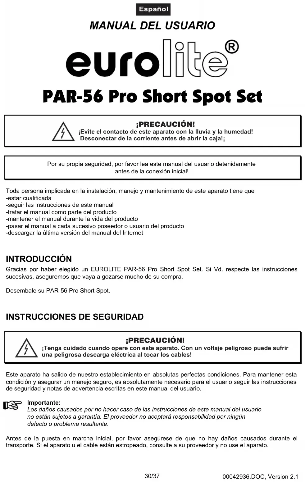 PAR-56 Pro Short Spot Set ¡Eviteelcontactodeesteaparatoconlalluviaylahumedad!Desconectardelacorrienteantesdeabrirlacaja!¡ ¡PRECAUCIÓN! Por su propia seguridad, por favor lea este manual del usuario detenidamenteantes de la conexión inicial!Toda persona implicada en la instalación, manejo y mantenimiento de este aparato tiene que-estar cualificada-seguir las instrucciones de este manual-tratar el manual como parte del producto-mantener el manual durante la vida del producto-pasar el manual a cada sucesivo poseedor o usuario del producto-descargar la última versión del manual del Internet INTRODUCCIÓN Gracias por haber elegido un EUROLITE PAR-56 Pro Short Spot Set. Si Vd. respecte las instruccionessucesivas, aseguremos que vaya a gozarse mucho de su compra.Desembale su PAR-56 Pro Short Spot.