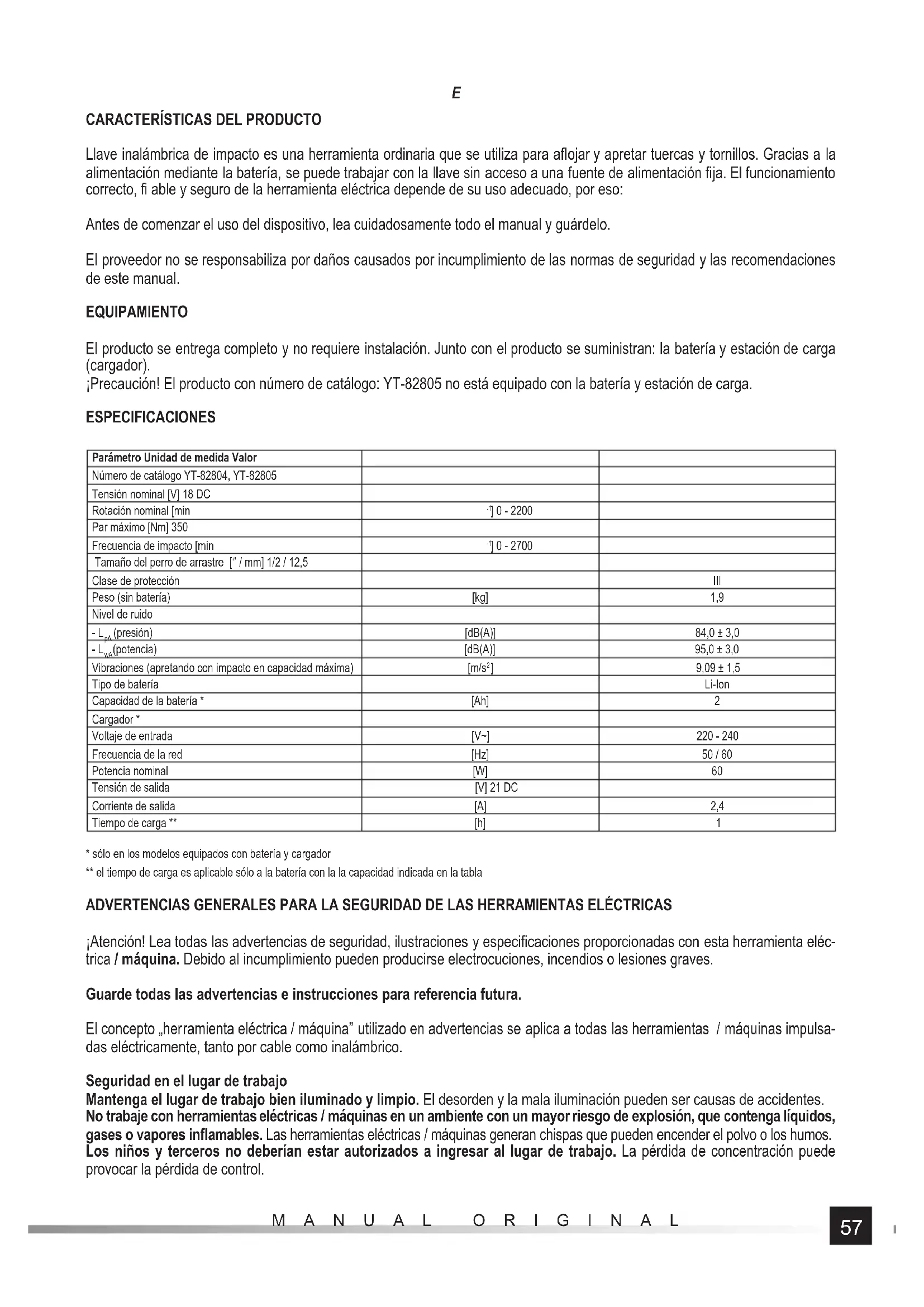 - sólo en los modelos equipados con batería y cargador ** el tiempo de carga es aplicable sólo a la batería con la la capacidad indicada en la tabla ADVERTENCIAS GENERALES PARA LA SEGURIDAD DE LAS HERRAMIENTAS ELÉCTRICAS ¡Atención! Lea todas las advertencias de seguridad, ilustraciones y especifi caciones proporcionadas con esta herramienta eléc- trica / máquina. Debido al incumplimiento pueden producirse electrocuciones, incendios o lesiones graves. Guarde todas las advertencias e instrucciones para referencia futura. El concepto „herramienta eléctrica / máquina” utilizado en advertencias se aplica a todas las herramientas / máquinas impulsa- das eléctricamente, tanto por cable como inalámbrico. Seguridad en el lugar de trabajo Mantenga el lugar de trabajo bien iluminado y limpio. El desorden y la mala iluminación pueden ser causas de accidentes. No trabaje con herramientas eléctricas / máquinas en un ambiente con un mayor riesgo de explosión, que contenga líquidos, gases o vapores infl amables. Las herramientas eléctricas / máquinas generan chispas que pueden encender el polvo o los humos. Los niños y terceros no deberían estar autorizados a ingresar al lugar de trabajo. La pérdida de concentración puede provocar la pérdida de control.58 MANUAL ORIGINAL