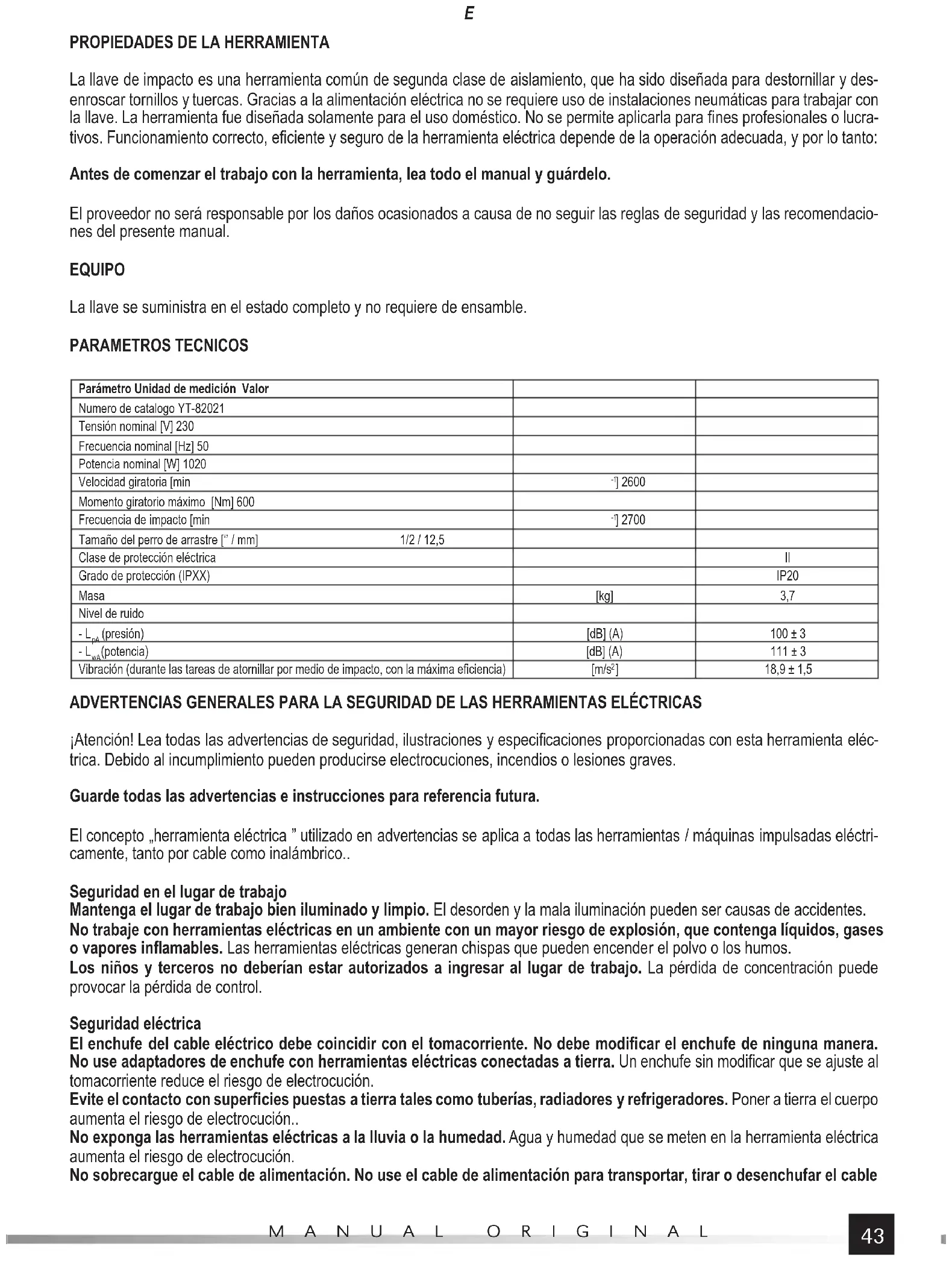 La llave de impacto es una herramienta común de segunda clase de aislamiento, que ha sido diseñada para destornillar y des- enroscar tornillos y tuercas. Gracias a la alimentación eléctrica no se requiere uso de instalaciones neumáticas para trabajar con la llave. La herramienta fue diseñada solamente para el uso doméstico. No se permite aplicarla para fi nes profesionales o lucra- tivos. Funcionamiento correcto, efi ciente y seguro de la herramienta eléctrica depende de la operación adecuada, y por lo tanto: Antes de comenzar el trabajo con la herramienta, lea todo el manual y guárdelo. El proveedor no será responsable por los daños ocasionados a causa de no seguir las reglas de seguridad y las recomendacio- nes del presente manual. EQUIPO La llave se suministra en el estado completo y no requiere de ensamble. PARAMETROS TECNICOS Parámetro Unidad de medición Valor Numero de catalogo YT-82021 Tensión nominal [V] 230 Frecuencia nominal [Hz] 50 Potencia nominal [W] 1020 Velocidad giratoria [min