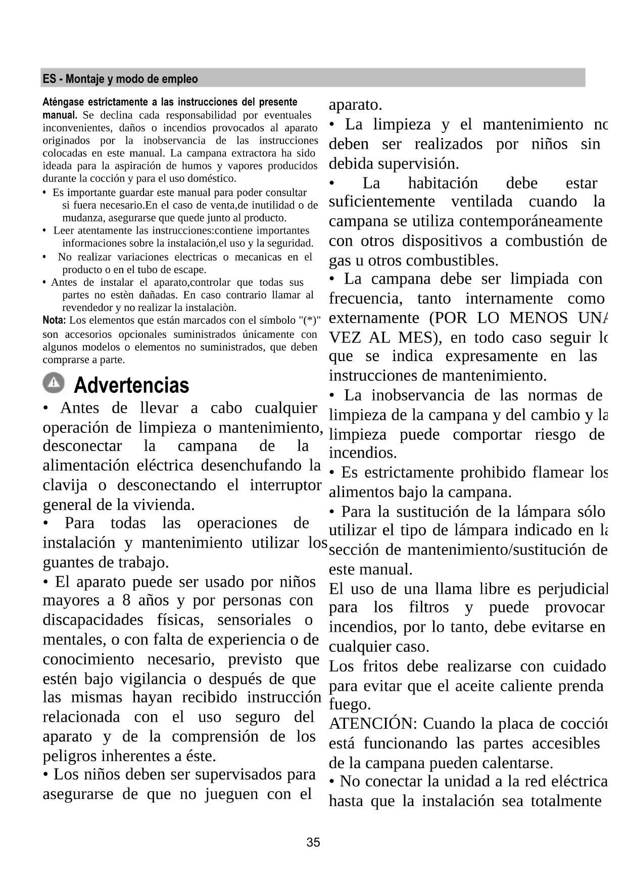 Monteer het rooster weer terug. Als een lampje het niet doet, kijkt u of ze goed zijn geplaatst voordat u om technische ondersteuning vraagt.35 ES - Montaje y modo de empleo Aténgase estrictamente a las instrucciones del presente manual. Se declina cada responsabilidad por eventuales inconvenientes, daños o incendios provocados al aparato originados por la inobservancia de las instrucciones colocadas en este manual. La campana extractora ha sido ideada para la aspiración de humos y vapores producidos durante la cocción y para el uso doméstico.