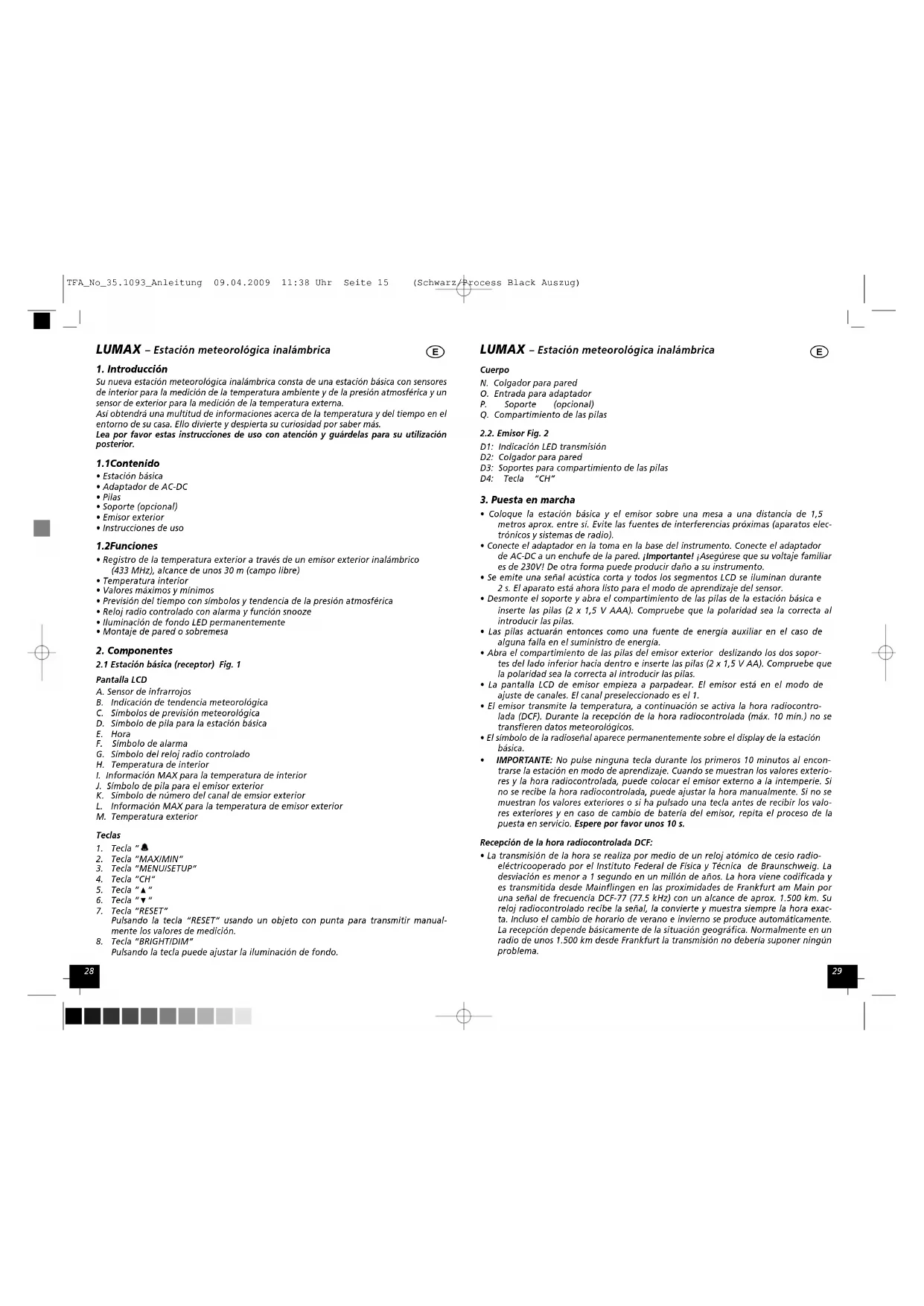 - Pulsando la tecla “MAX/MIN” puede llamar los valores máximos diarios de la temperatura interior y exterior. TFA_No_35.1093_Anleitung 09.04.2009 11:38 Uhr Seite 16 (Schwarz/Process Black Auszug)3332 LUMAX – Estación meteorológica inalámbrica