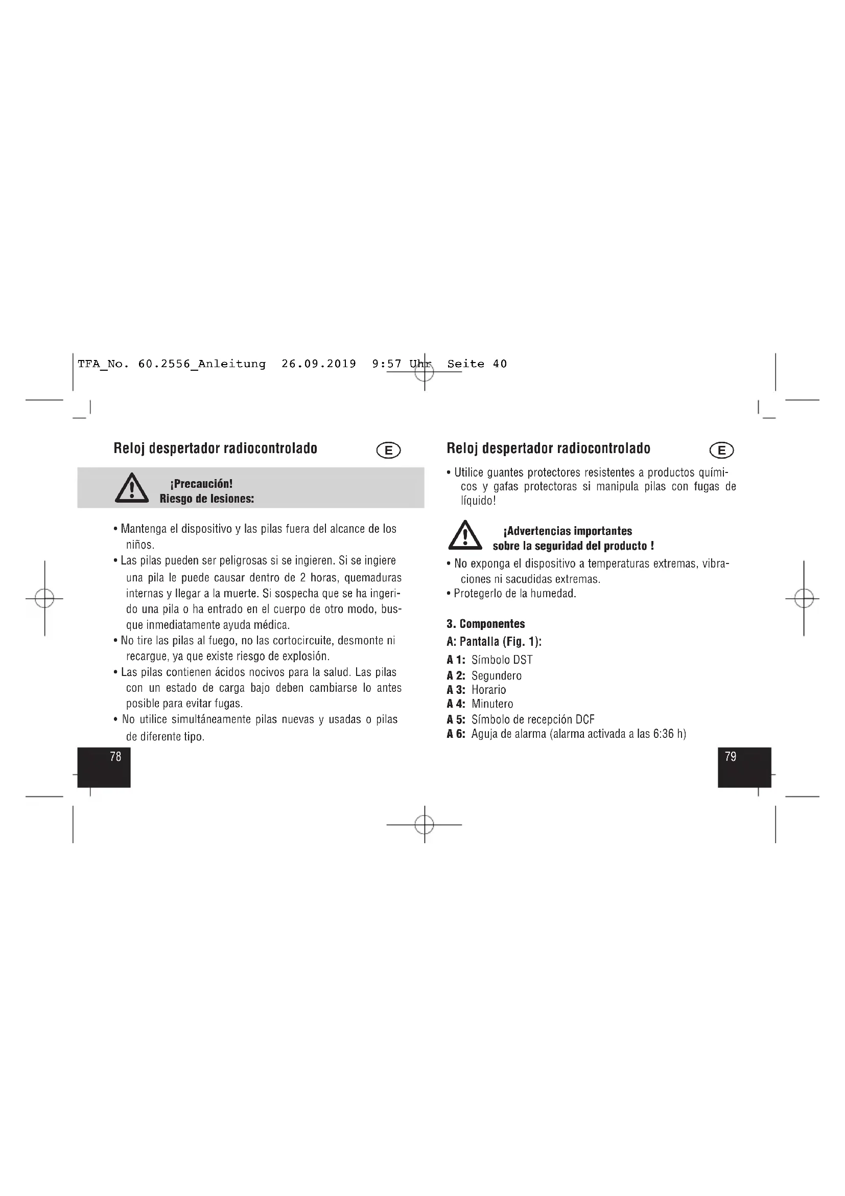 - No está permitido realizar reparaciones, transformaciones o modificaciones por cuenta propia en el dispositivo. TFA_No. 60.2556_Anleitung 26.09.2019 9:57 Uhr Seite 397978 Reloj despertador radiocontrolado