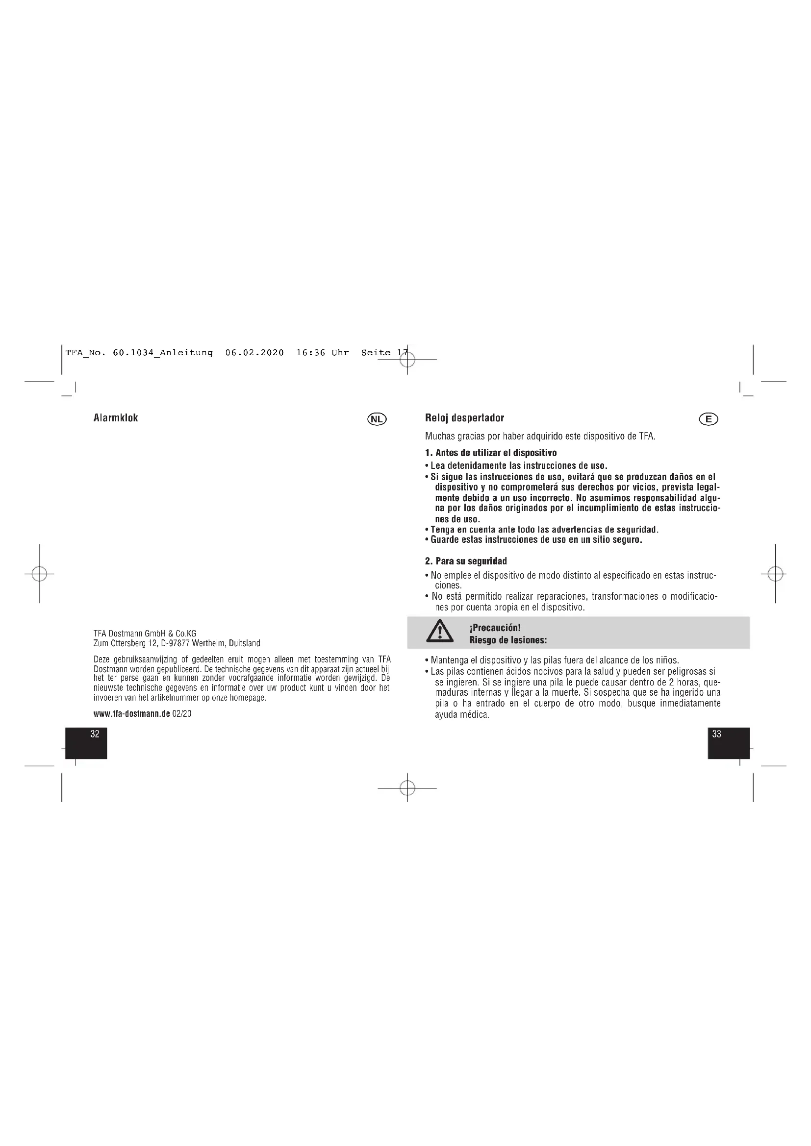 - Las pilas contienen ácidos nocivos para la salud y pueden ser peligrosas si se ingieren. Si se ingiere una pila le puede causar dentro de 2 horas, que- maduras internas y llegar a la muerte. Si sospecha que se ha ingerido una pila o ha entrado en el cuerpo de otro modo, busque inmediatamente ayuda médica. TFA_No. 60.1034_Anleitung 06.02.2020 16:36 Uhr Seite 173534 Reloj despertador