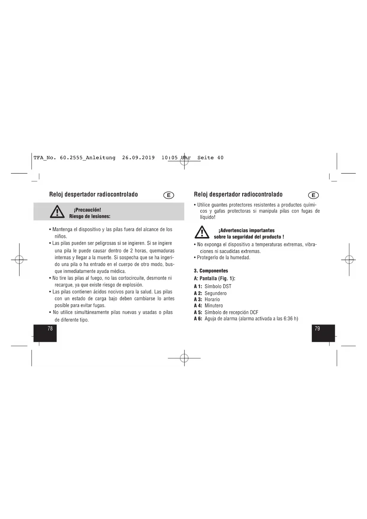 - No está permitido realizar reparaciones, transformaciones o modificaciones por cuenta propia en el dispositivo. TFA_No. 60.2555_Anleitung 26.09.2019 10:05 Uhr Seite 397978 Reloj despertador radiocontrolado