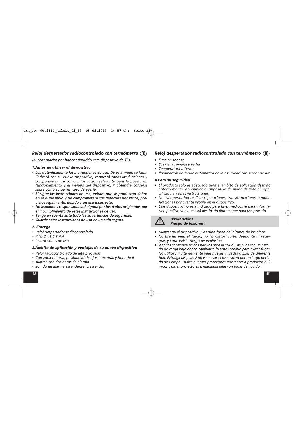 - Las pilas contienen ácidos nocivos para la salud. Las pilas con un esta- do de carga bajo deben cambiarse lo antes posible para evitar fugas. No utilice simultáneamente pilas nuevas y usadas o pilas de diferente tipo. Extraiga las pilas si no va a usar el dispositivo por un largo perío- do de tiempo. Utilice guantes protectores resistentes a productos quí- micos y gafas protectoras si manipula pilas con fugas de líquido. TFA_No. 60.2514_Anleit_02_13 05.02.2013 14:57 Uhr Seite 326564 Reloj despertador radiocontrolado con termómetro