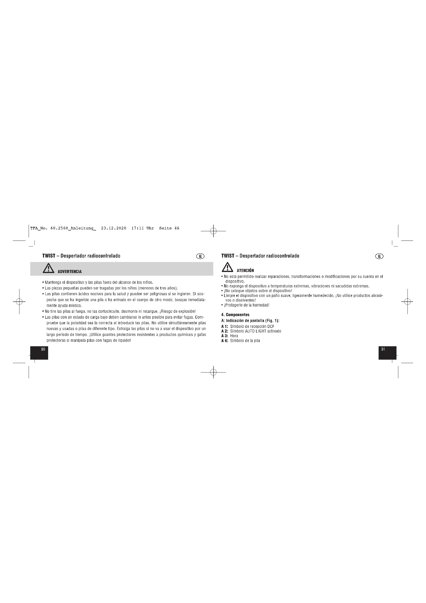- No emplee el dispositivo de modo distinto al especificado en estas instrucciones. TFA_No. 60.2560_Anleitung_ 23.12.2020 17:11 Uhr Seite 459190 TWIST – Despertador radiocontrolado