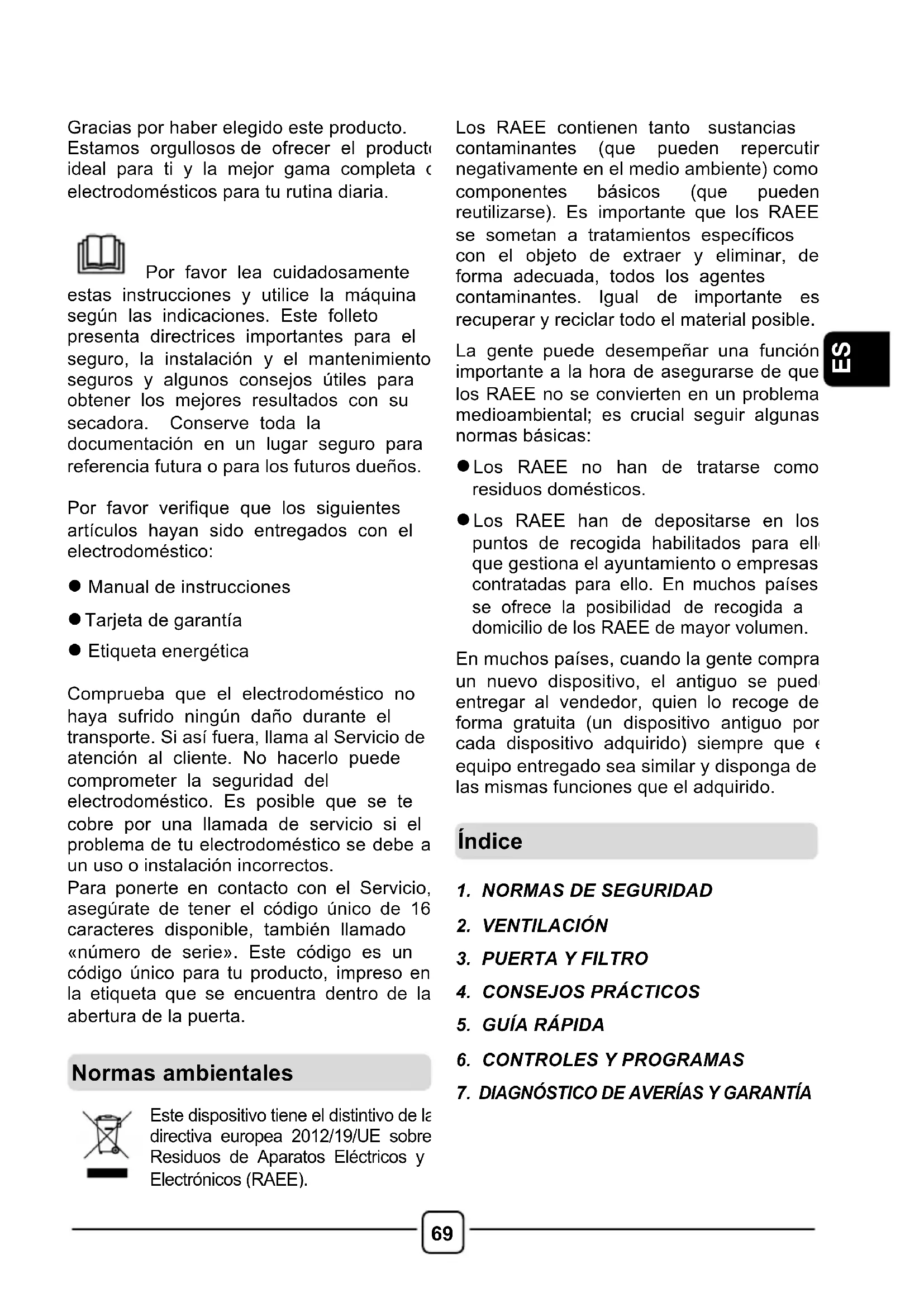 Gracias por haber elegido este producto. Estamos orgullosos de ofrecer el producto ideal para ti y la mejor gama completa de electrodomésticos para tu rutina diaria. Por favor lea cuidadosamente estas instrucciones y utilice la máquina según las indicaciones. Este folleto presenta directrices importantes para el seguro, la instalación y el mantenimiento seguros y algunos consejos útiles para obtener los mejores resultados con su secadora. Conserve toda la documentación en un lugar seguro para referencia futura o para los futuros dueños. Por favor verifique que los siguientes artículos hayan sido entregados con el electrodoméstico: l Manual de instrucciones l Tarjeta de garantía l Etiqueta energética Comprueba que el electrodoméstico no haya sufrido ningún daño durante el transporte. Si así fuera, llama al Servicio de atención al cliente. No hacerlo puede comprometer la seguridad del electrodoméstico. Es posible que se te cobre por una llamada de servicio si el problema de tu electrodoméstico se debe a un uso o instalación incorrectos. Para ponerte en contacto con el Servicio, asegúrate de tener el código único de 16 caracteres disponible, también llamado «número de serie». Este código es un código único para tu producto, impreso en la etiqueta que se encuentra dentro de la abertura de la puerta.