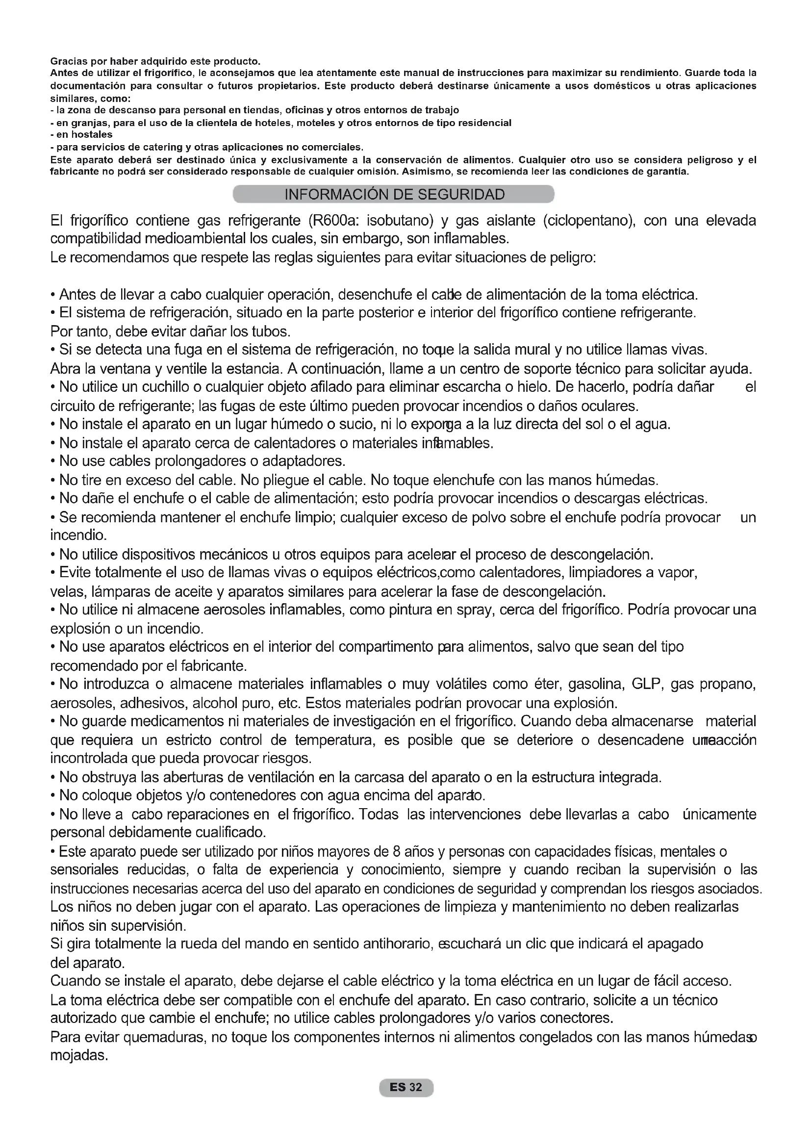 Gracias por haber adquirido este producto. Antes de utilizar el frigorífico, le aconsejamos que lea atentamente este manual de instrucciones para maximizar su rendimiento. Guarde toda la documentación para consultar o futuros propietarios. Este producto deberá destinarse únicamente a usos domésticos u otras aplicaciones similares, como: - la zona de descanso para personal en tiendas, oficinas y otros entornos de trabajo - en granjas, para el uso de la clientela de hoteles, moteles y otros entornos de tipo residencial - en hostales - para servicios de catering y otras aplicaciones no comerciales. Este aparato deberá ser destinado única y exclusivamente a la conservación de alimentos. Cualquier otro uso se considera peligroso y el fabricante no podrá ser considerado responsable de cualquier omisión. Asimismo, se recomienda leer las condiciones de garantía. El frigorífico contiene gas refrigerante (R600a: isobutano) y gas aislante (ciclopentano), con una elevada compatibilidad medioambiental los cuales, sin embargo, son inflamables. Le recomendamos que respete las reglas siguientes para evitar situaciones de peligro:
