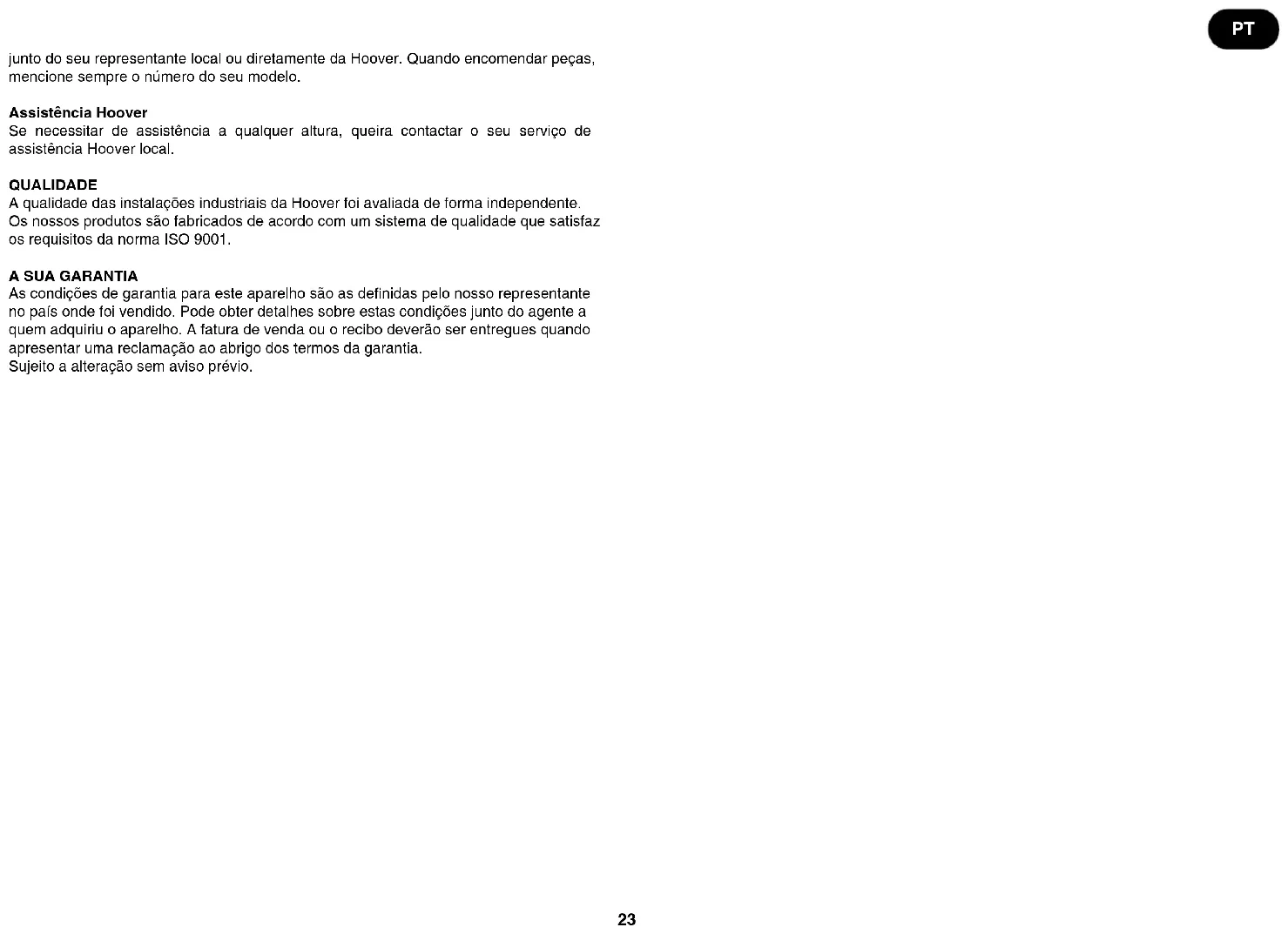 Utilice siempre piezas de repuesto originales de Hoover. Puede adquirirlas a través de su Servicio Técnico Ocial de Hoover. Cuando realice pedidos de piezas, indique siempre el número de serie del producto. Servicio técnico Hoover Si en cualquier momento necesitara efectuar reparaciones, por favor contacte Servicio Técnico de Hoover. CALIDAD Las fábricas de Hoover han sido sometidas a inspecciones de calidad independientes. Nuestros productos se fabrican de conformidad con un sistema de calidad que cumple los requisitos de la norma ISO 9001.