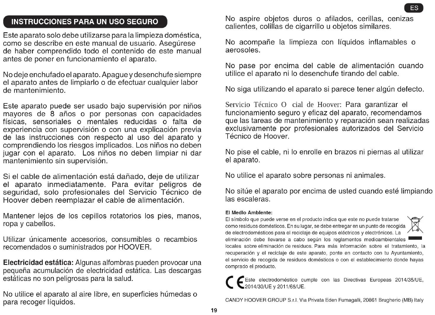 Este aparato solo debe utilizarse para la limpieza doméstica, como se describe en este manual de usuario. Asegúrese de haber comprendido todo el contenido de este manual antes de poner en funcionamiento el aparato. No deje enchufado el aparato. Apague y desenchufe siempre el aparato antes de limpiarlo o de efectuar cualquier labor de mantenimiento. Este aparato puede ser usado bajo supervisión por niños mayores de 8 años o por personas con capacidades físicas, sensoriales o mentales reducidas o falta de experiencia con supervisión o con una explicación previa de las instrucciones con respecto al uso del aparato y comprendiendo los riesgos implicados. Los niños no deben jugar con el aparato. Los niños no deben limpiar ni dar mantenimiento sin supervisión. Si el cable de alimentación está dañado, deje de utilizar el aparato inmediatamente. Para evitar peligros de seguridad, solo profesionales del Servicio Técnico de Hoover deben reemplazar el cable de alimentación. Mantener lejos de los cepillos rotatorios los pies, manos, ropa y cabellos. Utilizar únicamente accesorios, consumibles o recambios recomendados o suministrados por HOOVER. Electricidad estática: Algunas alfombras pueden provocar una pequeña acumulación de electricidad estática. Las descargas estáticas no son peligrosas para la salud. No utilice el aparato al aire libre, en supercies húmedas o para recoger líquidos. No aspire objetos duros o alados, cerillas, cenizas calientes, colillas de cigarrillo u objetos similares. No acompañe la limpieza con líquidos inamables o aerosoles. No pase por encima del cable de alimentación cuando utilice el aparato ni lo desenchufe tirando del cable. No siga utilizando el aparato si parece tener algún defecto. Servicio Técnico Ocial de Hoover: Para garantizar el funcionamiento seguro y ecaz del aparato, recomendamos que las tareas de mantenimiento y reparación sean realizadas exclusivamente por profesionales autorizados del Servicio Técnico de Hoover. No pise el cable, ni lo enrolle en brazos ni piernas al utilizar el aparato. No utilice el aparato sobre personas ni animales. No sitúe el aparato por encima de usted cuando esté limpiando las escaleras. El Medio Ambiente: El símbolo que puede verse en el producto indica que este no puede tratarse como residuos domésticos. En su lugar, se debe entregar en un punto de recogida de electrodomésticos para el reciclaje de equipos eléctricos y electrónicos. La eliminación debe llevarse a cabo según los reglamentos medioambientales locales sobre eliminación de residuos. Para más información sobre el tratamiento, la recuperación y el reciclaje de este aparato, ponte en contacto con tu Ayuntamiento, el servicio de recogida de residuos domésticos o con el establecimiento donde hayas comprado el producto. Este electrodoméstico cumple con las Directivas Europeas 2014/35/UE, 2014/30/UE y 2011/65/UE. CANDY HOOVER GROUP S.r.l. Via Privata Eden Fumagalli, 20861 Brugherio (MB) Italy ES20 *Disponible solo en algunos modelos **El diseño del cepillo puede variar según el modelo