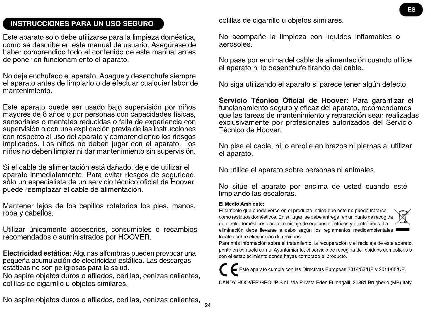 Este aparato solo debe utilizarse para la limpieza doméstica, como se describe en este manual de usuario. Asegúrese de haber comprendido todo el contenido de este manual antes de poner en funcionamiento el aparato. No deje enchufado el aparato. Apague y desenchufe siempre el aparato antes de limpiarlo o de efectuar cualquier labor de mantenimiento. Este aparato puede ser usado bajo supervisión por niños mayores de 8 años o por personas con capacidades físicas, sensoriales o mentales reducidas o falta de experiencia con supervisión o con una explicación previa de las instrucciones con respecto al uso del aparato y comprendiendo los riesgos implicados. Los niños no deben jugar con el aparato. Los niños no deben limpiar ni dar mantenimiento sin supervisión. Si el cable de alimentación está dañado, deje de utilizar el aparato inmediatamente. Para evitar riesgos de seguridad, sólo un especialista de un servicio técnico ocial de Hoover puede reemplazar el cable de alimentación. Mantener lejos de los cepillos rotatorios los pies, manos, ropa y cabellos. Utilizar únicamente accesorios, consumibles o recambios recomendados o suministrados por HOOVER. Electricidad estática: Algunas alfombras pueden provocar una pequeña acumulación de electricidad estática. Las descargas estáticas no son peligrosas para la salud. No aspire objetos duros o alados, cerillas, cenizas calientes, colillas de cigarrillo u objetos similares. No aspire objetos duros o alados, cerillas, cenizas calientes, colillas de cigarrillo u objetos similares. No acompañe la limpieza con líquidos inamables o aerosoles. No pase por encima del cable de alimentación cuando utilice el aparato ni lo desenchufe tirando del cable. No siga utilizando el aparato si parece tener algún defecto. Servicio Técnico Ocial de Hoover: Para garantizar el funcionamiento seguro y ecaz del aparato, recomendamos que las tareas de mantenimiento y reparación sean realizadas exclusivamente por profesionales autorizados del Servicio Técnico de Hoover. No pise el cable, ni lo enrolle en brazos ni piernas al utilizar el aparato. No utilice el aparato sobre personas ni animales. No sitúe el aparato por encima de usted cuando esté limpiando las escaleras. El Medio Ambiente: El símbolo que puede verse en el producto indica que este no puede tratarse como residuos domésticos. En su lugar, se debe entregar en un punto de recogida de electrodomésticos para el reciclaje de equipos eléctricos y electrónicos. La eliminación debe llevarse a cabo según los reglamentos medioambientales locales sobre eliminación de residuos. Para más información sobre el tratamiento, la recuperación y el reciclaje de este aparato, ponte en contacto con tu Ayuntamiento, el servicio de recogida de residuos domésticos o con el establecimiento donde hayas comprado el producto. Este aparato cumple con las Directivas Europeas 2014/53/UE y 2011/65/UE. CANDY HOOVER GROUP S.r.l. Via Privata Eden Fumagalli, 20861 Brugherio (MB) Italy ES25
