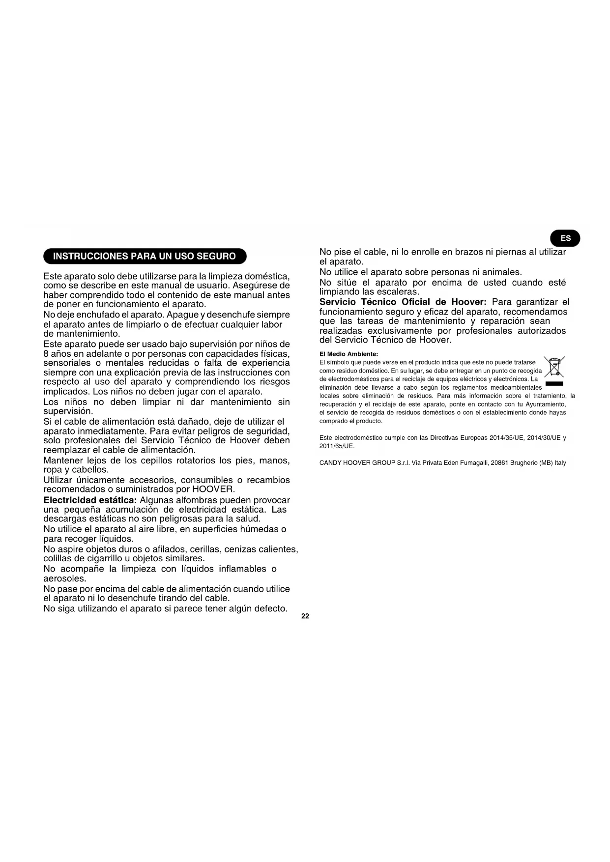 Este aparato solo debe utilizarse para la limpieza doméstica, como se describe en este manual de usuario. Asegúrese de haber comprendido todo el contenido de este manual antes de poner en funcionamiento el aparato. No deje enchufado el aparato. Apague y desenchufe siempre el aparato antes de limpiarlo o de efectuar cualquier labor de mantenimiento. Este aparato puede ser usado bajo supervisión por niños de 8 años en adelante o por personas con capacidades físicas, sensoriales o mentales reducidas o falta de experiencia siempre con una explicación previa de las instrucciones con respecto al uso del aparato y comprendiendo los riesgos implicados. Los niños no deben jugar con el aparato. Los niños no deben limpiar ni dar mantenimiento sin supervisión. Si el cable de alimentación está dañado, deje de utilizar el aparato inmediatamente. Para evitar peligros de seguridad, solo profesionales del Servicio Técnico de Hoover deben reemplazar el cable de alimentación. Mantener lejos de los cepillos rotatorios los pies, manos, ropa y cabellos. Utilizar únicamente accesorios, consumibles o recambios recomendados o suministrados por HOOVER. Electricidad estática: Algunas alfombras pueden provocar una pequeña acumulación de electricidad estática. Las descargas estáticas no son peligrosas para la salud. No utilice el aparato al aire libre, en supercies húmedas o para recoger líquidos. No aspire objetos duros o alados, cerillas, cenizas calientes, colillas de cigarrillo u objetos similares. No acompañe la limpieza con líquidos inamables o aerosoles. No pase por encima del cable de alimentación cuando utilice el aparato ni lo desenchufe tirando del cable. No siga utilizando el aparato si parece tener algún defecto. No pise el cable, ni lo enrolle en brazos ni piernas al utilizar el aparato. No utilice el aparato sobre personas ni animales. No sitúe el aparato por encima de usted cuando esté limpiando las escaleras. Servicio Técnico Ocial de Hoover: Para garantizar el funcionamiento seguro y ecaz del aparato, recomendamos que las tareas de mantenimiento y reparación sean realizadas exclusivamente por profesionales autorizados del Servicio Técnico de Hoover. El Medio Ambiente: El símbolo que puede verse en el producto indica que este no puede tratarse como residuo doméstico. En su lugar, se debe entregar en un punto de recogida de electrodomésticos para el reciclaje de equipos eléctricos y electrónicos. La eliminación debe llevarse a cabo según los reglamentos medioambientales locales sobre eliminación de residuos. Para más información sobre el tratamiento, la recuperación y el reciclaje de este aparato, ponte en contacto con tu Ayuntamiento, el servicio de recogida de residuos domésticos o con el establecimiento donde hayas comprado el producto. Este electrodoméstico cumple con las Directivas Europeas 2014/35/UE, 2014/30/UE y 2011/65/UE. CANDY HOOVER GROUP S.r.l. Via Privata Eden Fumagalli, 20861 Brugherio (MB) Italy23