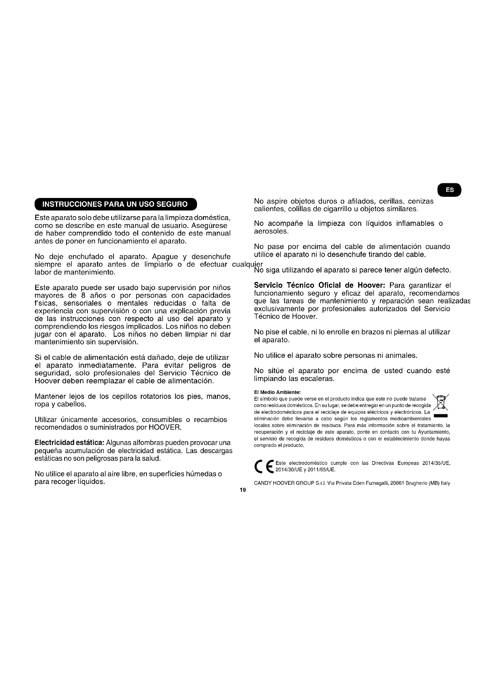 Este aparato solo debe utilizarse para la limpieza doméstica, como se describe en este manual de usuario. Asegúrese de haber comprendido todo el contenido de este manual antes de poner en funcionamiento el aparato. No deje enchufado el aparato. Apague y desenchufe siempre el aparato antes de limpiarlo o de efectuar cualquier labor de mantenimiento. Este aparato puede ser usado bajo supervisión por niños mayores de 8 años o por personas con capacidades físicas, sensoriales o mentales reducidas o falta de experiencia con supervisión o con una explicación previa de las instrucciones con respecto al uso del aparato y comprendiendo los riesgos implicados. Los niños no deben jugar con el aparato. Los niños no deben limpiar ni dar mantenimiento sin supervisión. Si el cable de alimentación está dañado, deje de utilizar el aparato inmediatamente. Para evitar peligros de seguridad, solo profesionales del Servicio Técnico de Hoover deben reemplazar el cable de alimentación. Mantener lejos de los cepillos rotatorios los pies, manos, ropa y cabellos. Utilizar únicamente accesorios, consumibles o recambios recomendados o suministrados por HOOVER. Electricidad estática: Algunas alfombras pueden provocar una pequeña acumulación de electricidad estática. Las descargas estáticas no son peligrosas para la salud. No utilice el aparato al aire libre, en supercies húmedas o para recoger líquidos. No aspire objetos duros o alados, cerillas, cenizas calientes, colillas de cigarrillo u objetos similares. No acompañe la limpieza con líquidos inamables o aerosoles. No pase por encima del cable de alimentación cuando utilice el aparato ni lo desenchufe tirando del cable. No siga utilizando el aparato si parece tener algún defecto. Servicio Técnico Ocial de Hoover: Para garantizar el funcionamiento seguro y ecaz del aparato, recomendamos que las tareas de mantenimiento y reparación sean realizadas exclusivamente por profesionales autorizados del Servicio Técnico de Hoover. No pise el cable, ni lo enrolle en brazos ni piernas al utilizar el aparato. No utilice el aparato sobre personas ni animales. No sitúe el aparato por encima de usted cuando esté limpiando las escaleras. El Medio Ambiente: El símbolo que puede verse en el producto indica que este no puede tratarse como residuos domésticos. En su lugar, se debe entregar en un punto de recogida de electrodomésticos para el reciclaje de equipos eléctricos y electrónicos. La eliminación debe llevarse a cabo según los reglamentos medioambientales locales sobre eliminación de residuos. Para más información sobre el tratamiento, la recuperación y el reciclaje de este aparato, ponte en contacto con tu Ayuntamiento, el servicio de recogida de residuos domésticos o con el establecimiento donde hayas comprado el producto. Este electrodoméstico cumple con las Directivas Europeas 2014/35/UE, 2014/30/UE y 2011/65/UE. CANDY HOOVER GROUP S.r.l. Via Privata Eden Fumagalli, 20861 Brugherio (MB) Italy ES20