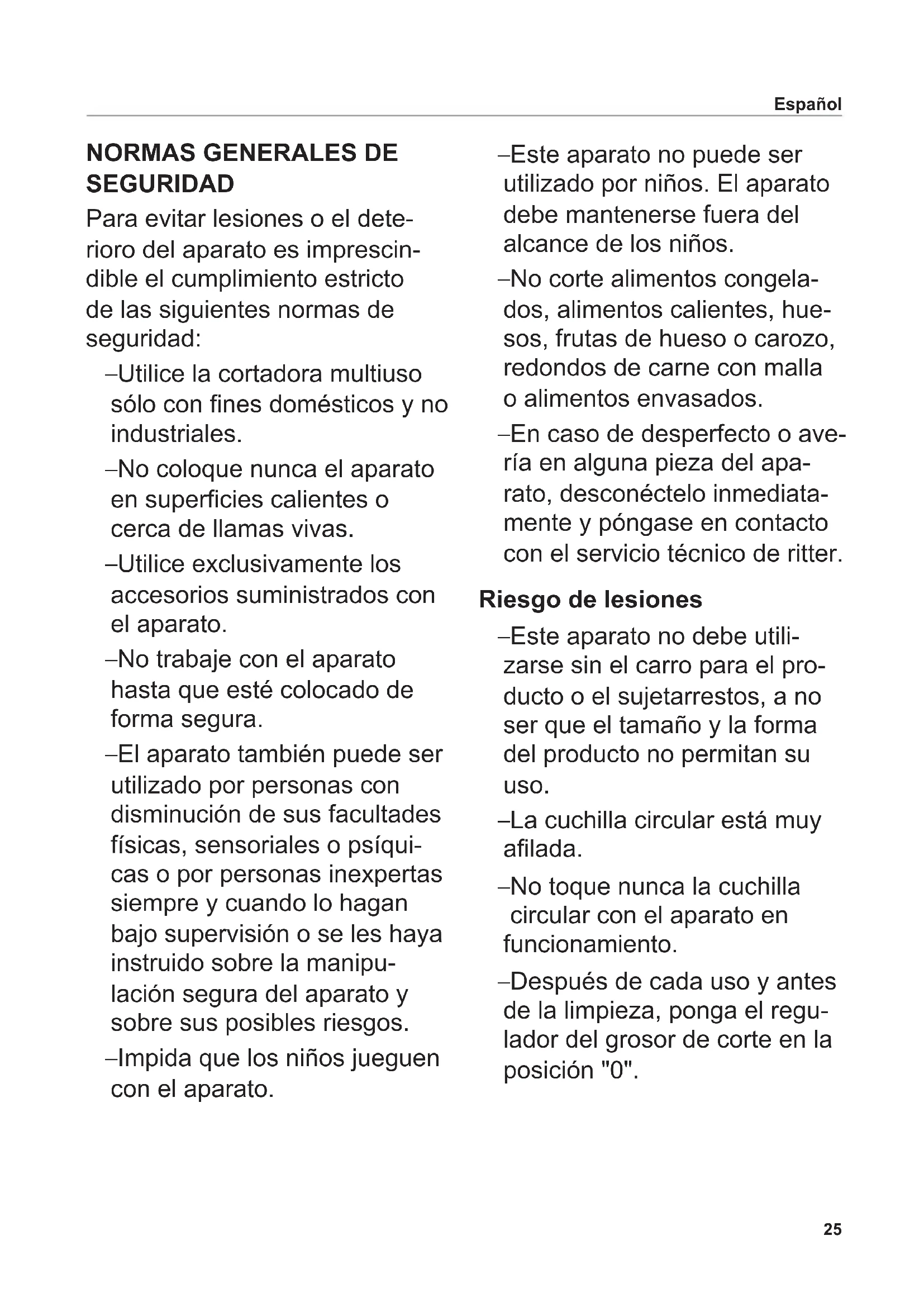 SEGURIDAD Para evitar lesiones o el dete- rioro del aparato es imprescin- dible el cumplimiento estricto de las siguientes normas de seguridad: – Utilice la cortadora multiuso sólo con nes domésticos y no industriales. – No coloque nunca el aparato en supercies calientes o cerca de llamas vivas. – Utilice exclusivamente los accesorios suministrados con el aparato. – No trabaje con el aparato hasta que esté colocado de forma segura. – El aparato también puede ser utilizado por personas con disminución de sus facultades físicas, sensoriales o psíqui- cas o por personas inexpertas siempre y cuando lo hagan bajo supervisión o se les haya instruido sobre la manipu- lación segura del aparato y sobre sus posibles riesgos. – Impida que los niños jueguen con el aparato. – Este aparato no puede ser utilizado por niños. El aparato debe mantenerse fuera del alcance de los niños. – No corte alimentos congela- dos, alimentos calientes, hue- sos, frutas de hueso o carozo, redondos de carne con malla o alimentos envasados. – En caso de desperfecto o ave- ría en alguna pieza del apa- rato, desconéctelo inmediata- mente y póngase en contacto con el servicio técnico de ritter. Riesgo de lesiones – Este aparato no debe utili- zarse sin el carro para el pro- ducto o el sujetarrestos, a no ser que el tamaño y la forma del producto no permitan su uso. – La cuchilla circular está muy alada. – No toque nunca la cuchilla circular con el aparato en funcionamiento. – Después de cada uso y antes de la limpieza, ponga el regu- lador del grosor de corte en la posición "0". Español26 Despliegue los grácos de la cubierta anterior y posterior. Lea atentamente las instruccio- nes antes de poner en marcha el aparato. Conserve las instruccio- nes de uso y adjúntelas cuando entregue el aparato a una tercera persona. La versión actualizada de las ins- trucciones de uso se encuentra disponible en www.ritterwerk.de. FIN PREVISTO La cortadora multiuso manual sirve para cortar alimentos comunes. Esta cortadora multiuso es apta para el contacto con alimentos. Un uso distinto del previsto o una utilización incorrecta puede pro- vocar lesiones graves o daños en el aparato. Además, anula cual- quier derecho de garantía y de reclamación de responsabilidad.