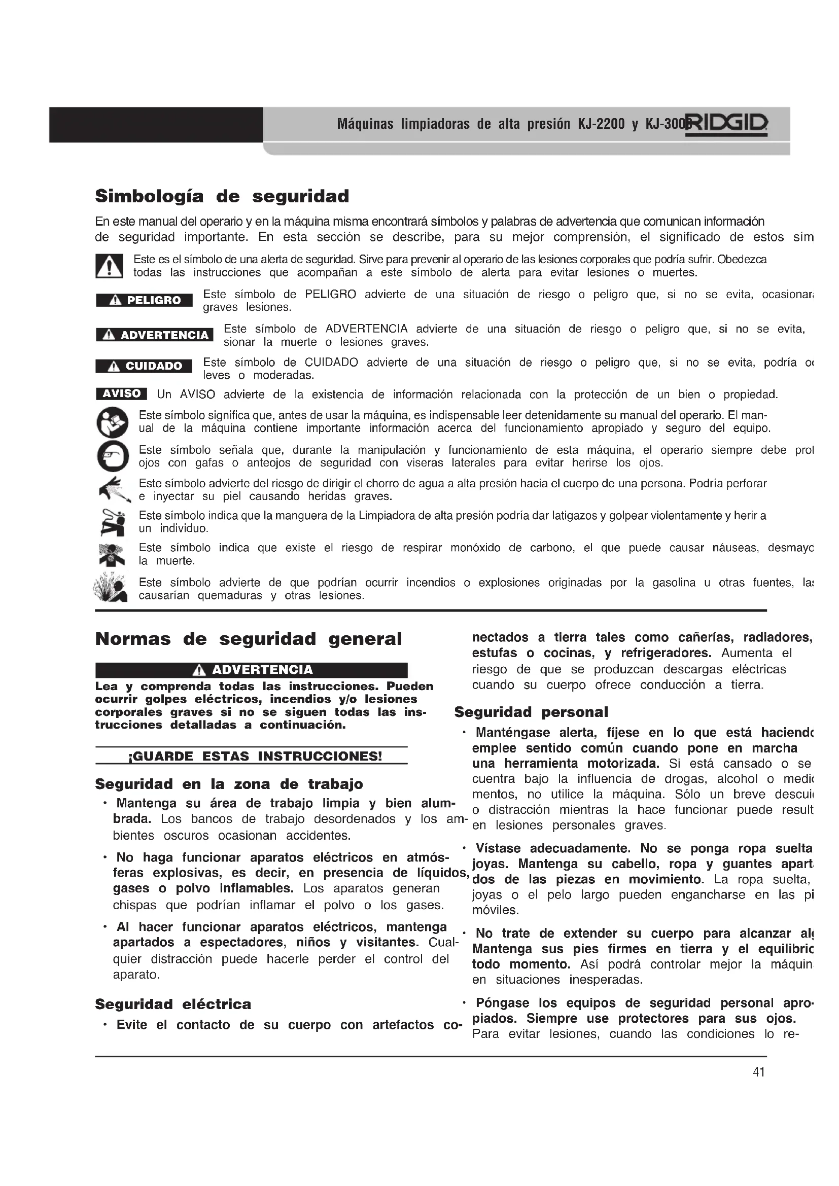Máquinas limpiadoras de alta presión KJ-2200 y KJ-300041 Máquinas limpiadoras de alta presión KJ-2200 y KJ-3000 Normas de seguridad general ADVERTENCIA Lea y comprenda todas las instrucciones. Pueden ocurrir golpes eléctricos, incendios y/o lesiones corporales graves si no se siguen todas las ins- trucciones detalladas a continuación. ¡GUARDE ESTAS INSTRUCCIONES! Seguridad en la zona de trabajo