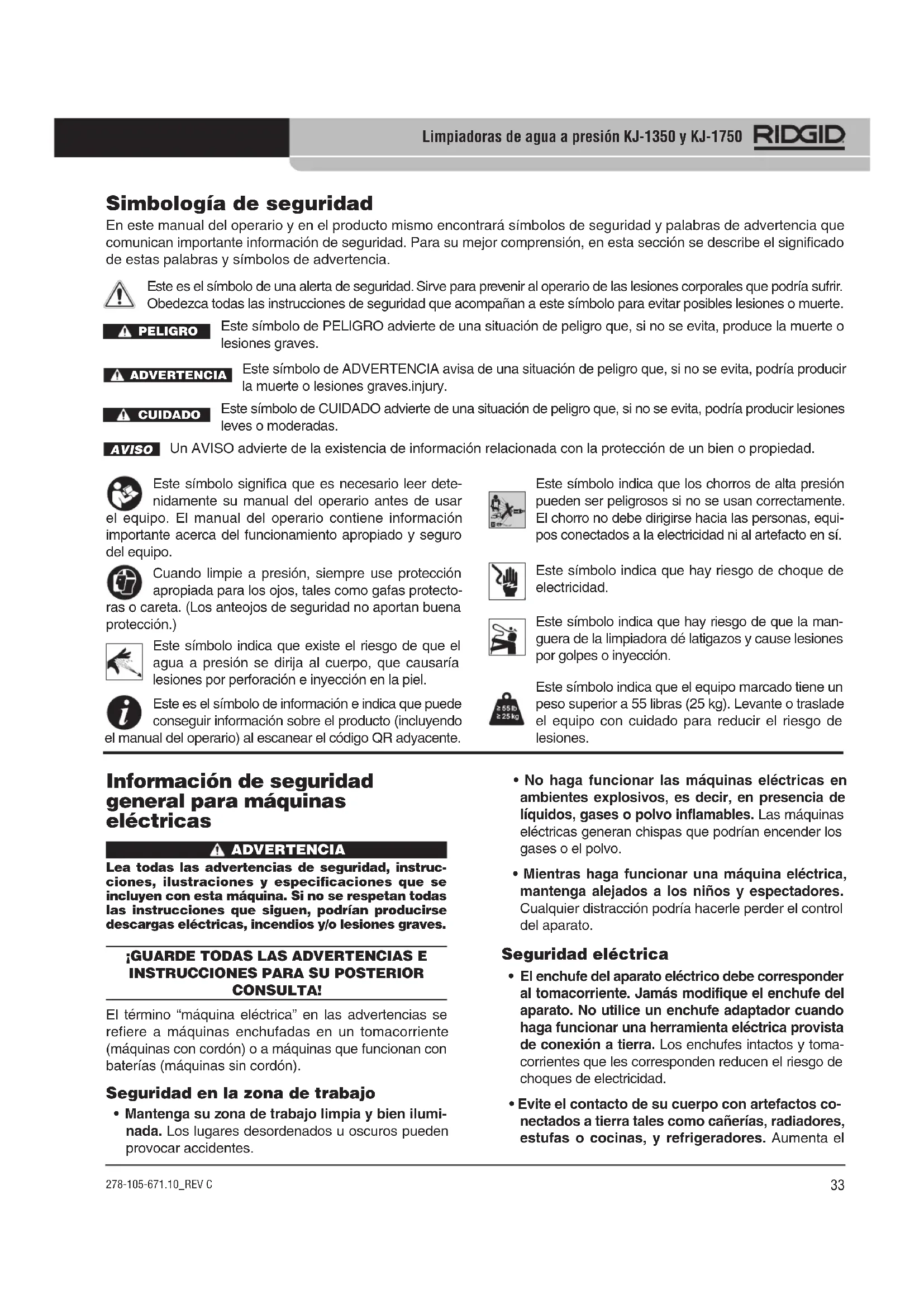 - Evite el contacto de su cuerpo con artefactos co- nectados a tierra tales como cañerías, radiadores, estufas o cocinas, y refrigeradores. Aumenta el Simbología de seguridad En este manual del operario y en el producto mismo encontrará símbolos de seguridad y palabras de advertencia que comunican importante información de seguridad. Para su mejor comprensión, en esta sección se describe el significado de estas palabras y símbolos de advertencia. Este es el símbolo de una alerta de seguridad. Sirve para prevenir al operario de las lesiones corporales que podría sufrir. Obedezca todas las instrucciones de seguridad que acompañan a este símbolo para evitar posibles lesiones o muerte. Este símbolo de PELIGRO advierte de una situación de peligro que, si no se evita, produce la muerte o lesiones graves. Este símbolo de ADVERTENCIA avisa de una situación de peligro que, si no se evita, podría producir la muerte o lesiones graves.injury. Este símbolo de CUIDADO advierte de una situación de peligro que, si no se evita, podría producir lesiones leves o moderadas. Un AVISO advierte de la existencia de información relacionada con la protección de un bien o propiedad. Este símbolo significa que es necesario leer dete- nidamente su manual del operario antes de usar el equipo. El manual del operario contiene información importante acerca del funcionamiento apropiado y seguro del equipo. AVISO PELIGRO ADVERTENCIA CUIDADO Este símbolo indica que hay riesgo de choque de electricidad. Este es el símbolo de información e indica que puede conseguir información sobre el producto (incluyendo el manual del operario) al escanear el código QR adyacente. Este símbolo indica que existe el riesgo de que el agua a presión se dirija al cuerpo, que causaría lesiones por perforación e inyección en la piel. Este símbolo indica que los chorros de alta presión pueden ser peligrosos si no se usan correctamente. El chorro no debe dirigirse hacia las personas, equi- pos conectados a la electricidad ni al artefacto en sí. Este símbolo indica que hay riesgo de que la man- guera de la limpiadora dé latigazos y cause lesiones por golpes o inyección. Este símbolo indica que el equipo marcado tiene un peso superior a 55 libras (25 kg). Levante o traslade el equipo con cuidado para reducir el riesgo de lesiones.Limpiadoras de agua a presión KJ-1350 y KJ-1750