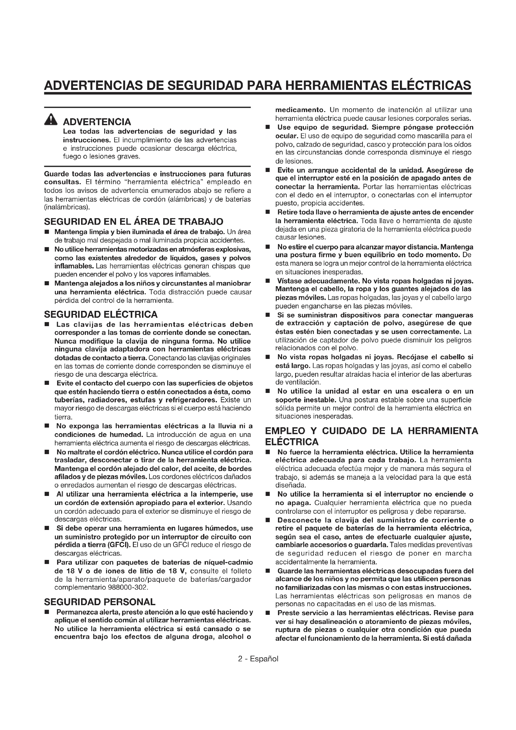 Ne jamais laisser de liquides tels que le fluide de freins, l’essence, les produits à sabot de pétrole, les huiles pénétrantes, etc., entrer en contact avec les pièces en plastique. Les produits chimiques peuvent endommager, affaiblir ou détruire le plastique, ce qui peut entraîner des blessures graves.2 - Español ADVERTENCIAS DE SEGURIDAD PARA HERRAMIENTAS ELÉCTRICAS ADVERTENCIA Lea todas las advertencias de seguridad y las instrucciones. El incumplimiento de las advertencias e instrucciones puede ocasionar descarga eléctrica, fuego o lesiones graves. Guarde todas las advertencias e instrucciones para futuras consultas. El término “herramienta eléctrica” empleado en todos los avisos de advertencia enumerados abajo se refiere a las herramientas eléctricas de cordón (alámbricas) y de baterías (inalámbricas).