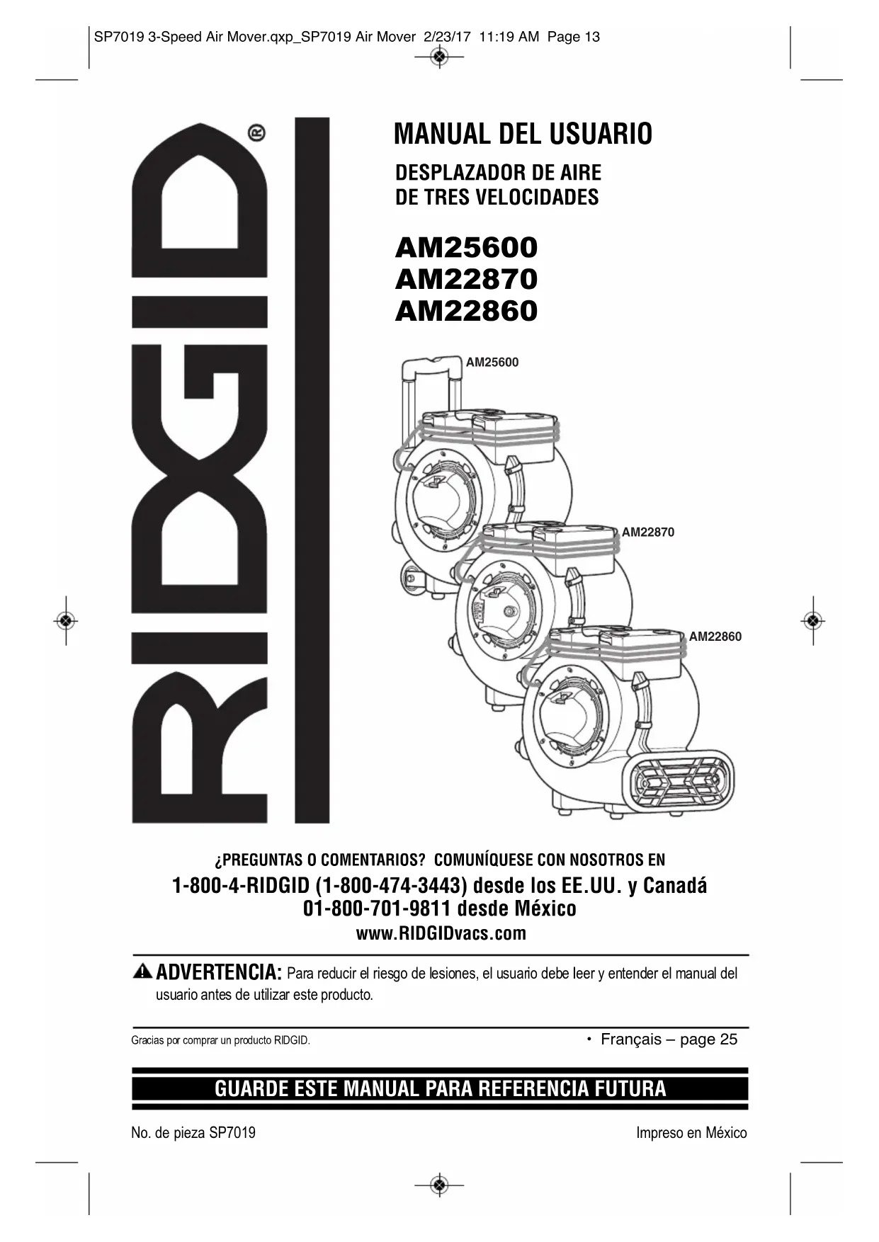 . Ningúnempleado, agente, distribuidor u otra persona está autorizado a alterar esta garantía ni a dar ninguna otragarantía en nombre de RIDGE TOOL COMPANY. No. de existencias AM2286, AM2287, AM2560 No. de modelo AM22860, AM22870, AM25600 El número de modelo y el número de serie se pueden encontrar en la parte trasera de la unidad. Debe anotar tanto el número de modelo como el de serie en un lugar seguro para uso futuro. Símbolo de calidad, durabilidad y confiabilidad SP7019 3-Speed Air Mover.qxp_SP7019 Air Mover 2/23/17 11:20 AM Page 24AM25600 AM22870 AM22860 AM25600AM22870AM22860