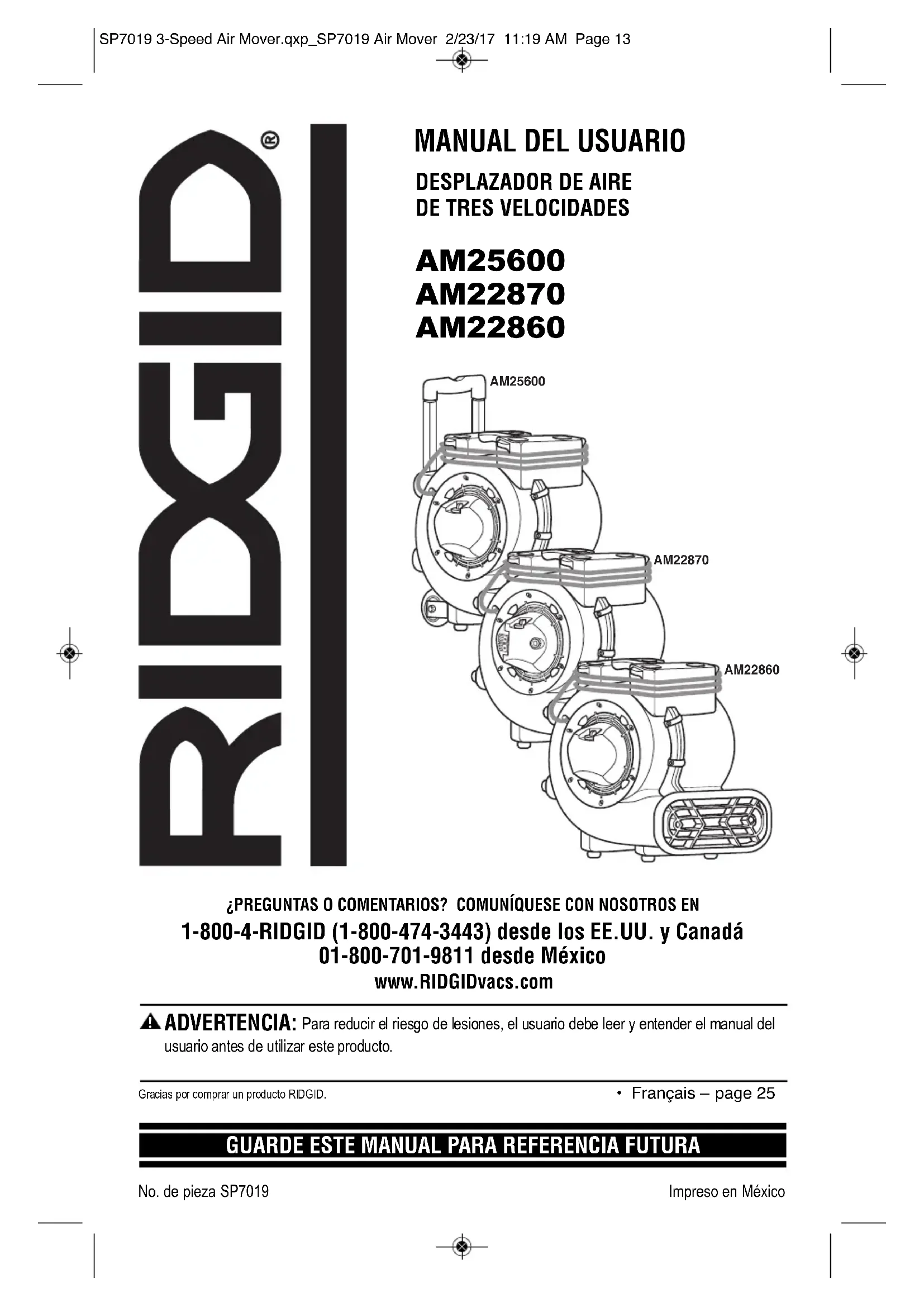 Encuentra gratis el manual del aparato AM22860 RIDGID en formato PDF.