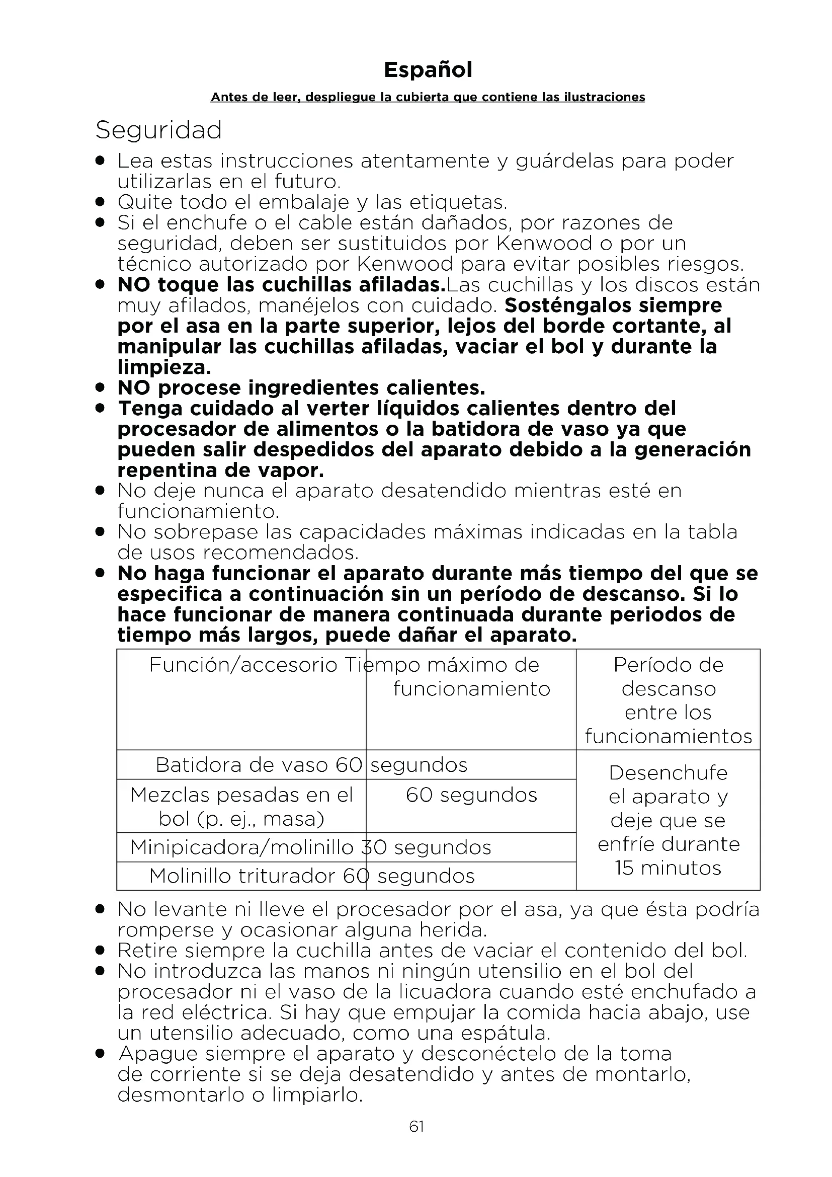 No haga funcionar el aparato durante más tiempo del que se especifica a continuación sin un período de descanso. Si lo hace funcionar de manera continuada durante periodos de tiempo más largos, puede dañar el aparato. Función/accesorio Tiempo máximo de funcionamiento Período de descanso entre los funcionamientos Batidora de vaso 60 segundos Desenchufe el aparato y deje que se enfríe durante 15 minutos Mezclas pesadas en el bol (p. ej., masa) 60 segundos Minipicadora/molinillo 30 segundos Molinillo triturador 60 segundos
