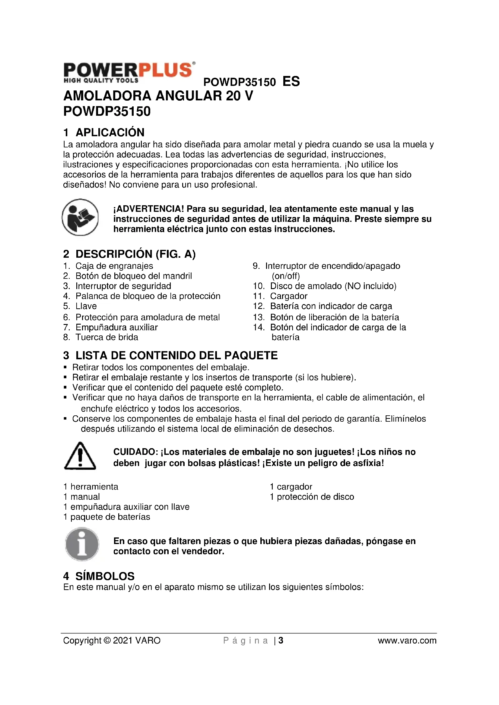 - Conserve los componentes de embalaje hasta el final del periodo de garantía. Elimínelos después utilizando el sistema local de eliminación de desechos. CUIDADO: ¡Los materiales de embalaje no son juguetes! ¡Los niños no deben jugar con bolsas plásticas! ¡Existe un peligro de asfixia! 1 herramienta 1 manual 1 empuñadura auxiliar con llave 1 paquete de baterías 1 cargador 1 protección de disco En caso que faltaren piezas o que hubiera piezas dañadas, póngase en contacto con el vendedor. 4 SÍMBOLOS En este manual y/o en el aparato mismo se utilizan los siguientes símbolos:POWDP35150 ES Copyright © 2021 VARO P á g i n a | 4 www.varo.com