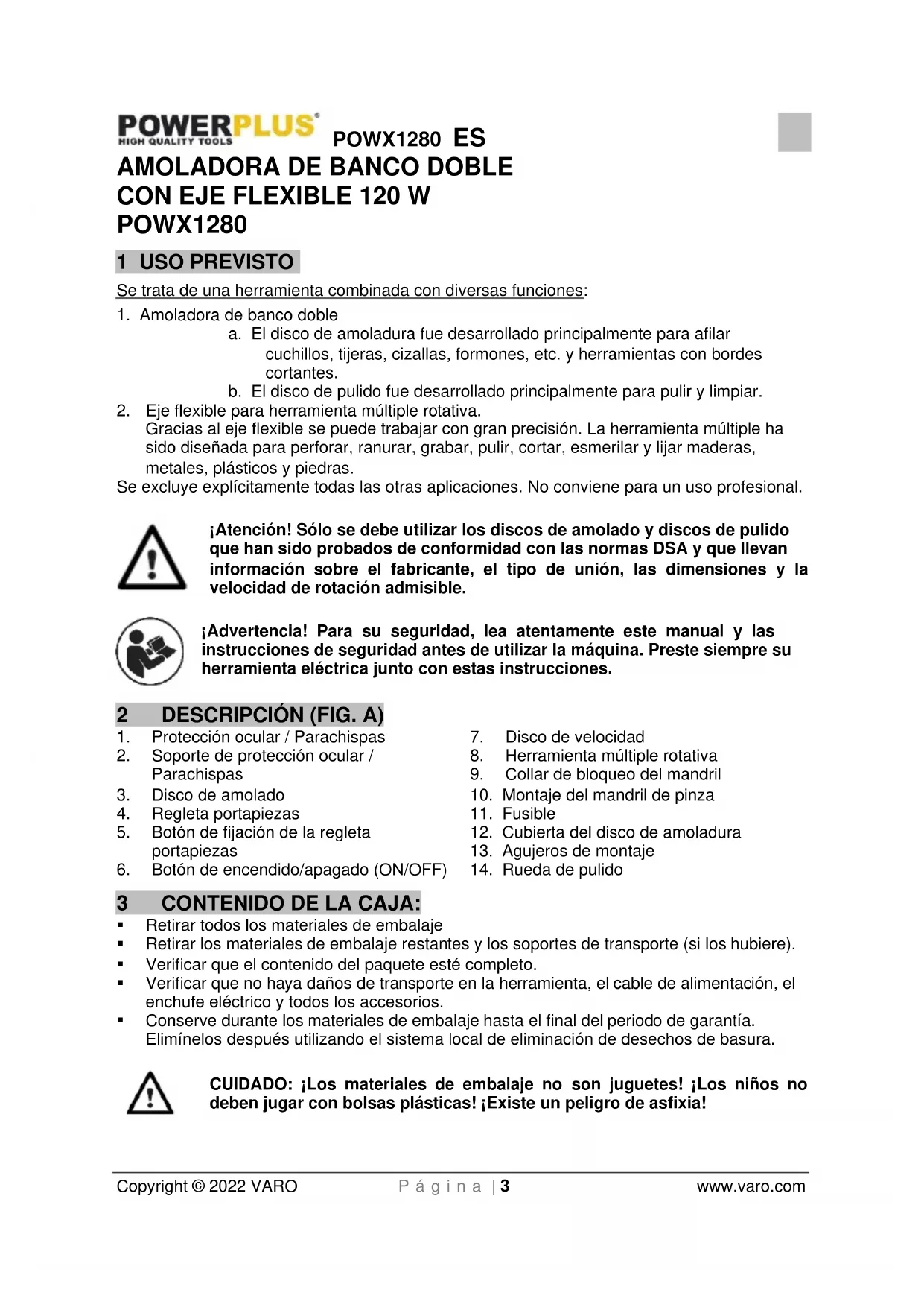 ¡Atención! Antes de llevar a cabo cualquier trabajo en el equipo, desconecte el enchufe de alimentación. No utilice la herramienta sobre metal liviano con un contenido de magnesio superior al 80 %, dado que este tipo de metal es inflamable. Pruebe siempre cualquier punta o útil en una pieza de desecho o en una parte invisible del material de trabajo para evitar dañar la pieza de trabajo.POWX1280 ES Copyright © 2022 VARO P á g i n a | 10 www.varo.com