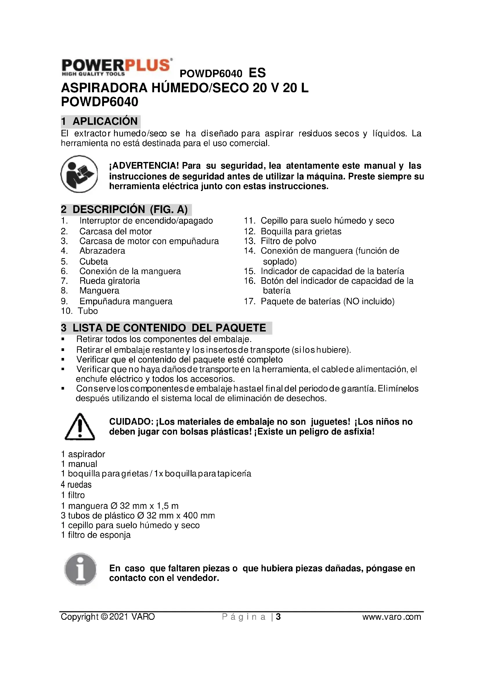 - Conserve los componentes de embalaje hasta el final del periodo de garantía. Elimínelos después utilizando el sistema local de eliminación de desechos. CUIDADO: ¡Los materiales de embalaje no son juguetes! ¡Los niños no deben jugar con bolsas plásticas! ¡Existe un peligro de asfixia! 1 aspirador 1 manual 1 boquilla para grietas / 1x boquilla para tapicería 4 ruedas 1 filtro 1 manguera Ø 32 mm x 1,5 m 3 tubos de plástico Ø 32 mm x 400 mm 1 cepillo para suelo húmedo y seco 1 filtro de esponja En caso que faltaren piezas o que hubiera piezas dañadas, póngase en contacto con el vendedor.POWDP6040 ES Copyright © 2021 VARO P á g i n a | 4 www.varo.com 4 SÍMBOLOS En este manual y/o en el aparato mismo se utilizan los siguientes símbolos: