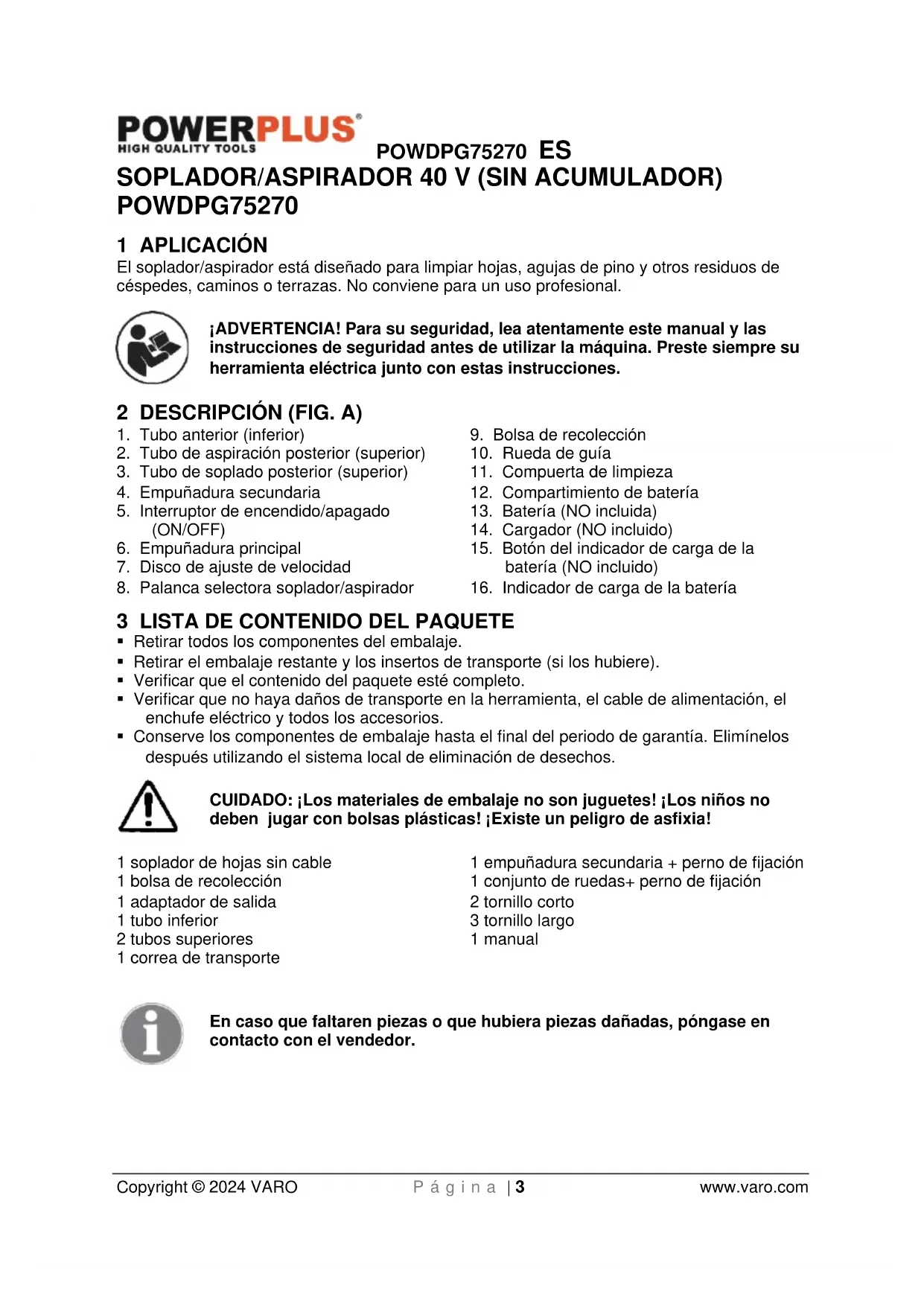Copyright © 2024 VARO P á g i n a | 3 www.varo.com SOPLADOR/ASPIRADOR 40 V (SIN ACUMULADOR) POWDPG75270 1 APLICACIÓN El soplador/aspirador está diseñado para limpiar hojas, agujas de pino y otros residuos de céspedes, caminos o terrazas. No conviene para un uso profesional. ¡ADVERTENCIA! Para su seguridad, lea atentamente este manual y las instrucciones de seguridad antes de utilizar la máquina. Preste siempre su herramienta eléctrica junto con estas instrucciones. 2 DESCRIPCIÓN (FIG. A)