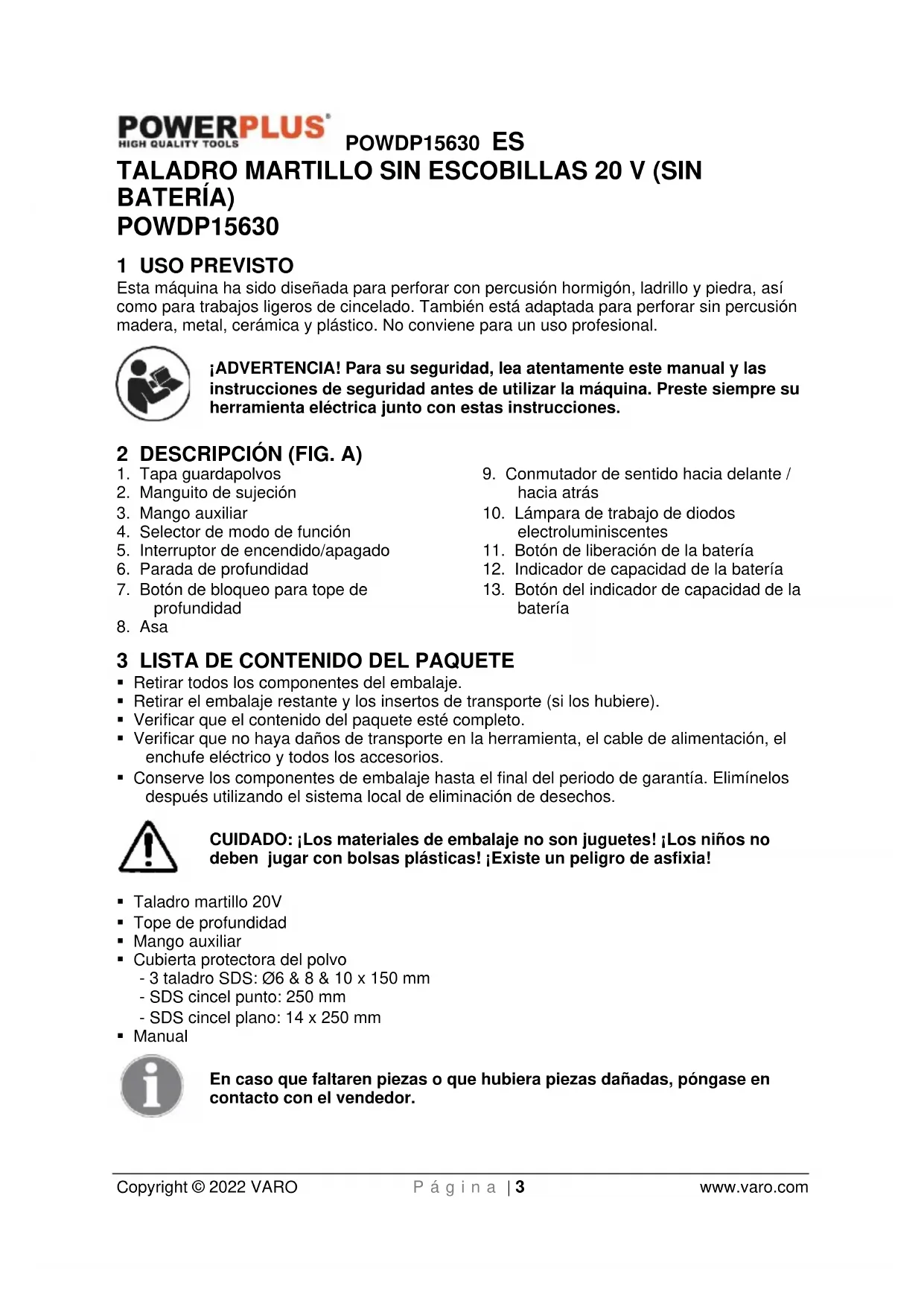 - Compruebe regularmente que el portaherramientas no esté desgastado o dañadoPOWDP15630 ES Copyright © 2022 VARO P á g i n a | 7 www.varo.com