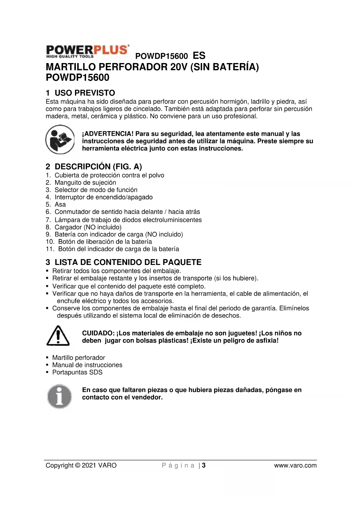VARO – VIC. VAN ROMPUY N.V. – Joseph Van Instraat 9. BE2500 Lier – Bélgica, declara que: Tipo de aparato: MARTILLO PERFORADOR 20V (SIN BATERÍA) Marca: POWERplus Número del producto: POWDP15600 está en conformidad con los requisitos esenciales y otras disposiciones pertinentes de las Directivas europeas aplicables, basados en la aplicación de las normas europeas armonizadas. Cualquier modificación no autorizada de este aparato anula esta declaración. Directivas europeas (incluyendo, si se aplica, sus respectivas enmiendas hasta la fecha de la firma): 2011/65/EU 2006/42/EC 2014/30/EU Normas europeas armonizadas (incluyendo, si se aplica, sus respectivas hasta la fecha de la firma): EN60745-1 : 2009 EN60745-2-6 : 2010 EN55014-1 : 2017 EN55014-2 : 2015 Custodio de la documentación técnica: Philippe Vankerkhove, VARO – Vic. Van Rompuy N.V. El suscrito actúa en nombre del director general de la compañía, Ludo Mertens Asuntos reglamentarios - Director de conformidad 23/08/2021, Lier - BelgiumPOWDP15600 IT Copyright © 2021 VARO Pag. | 1 www.varo.com 1 USO PREVISTO .............................................................................. 3