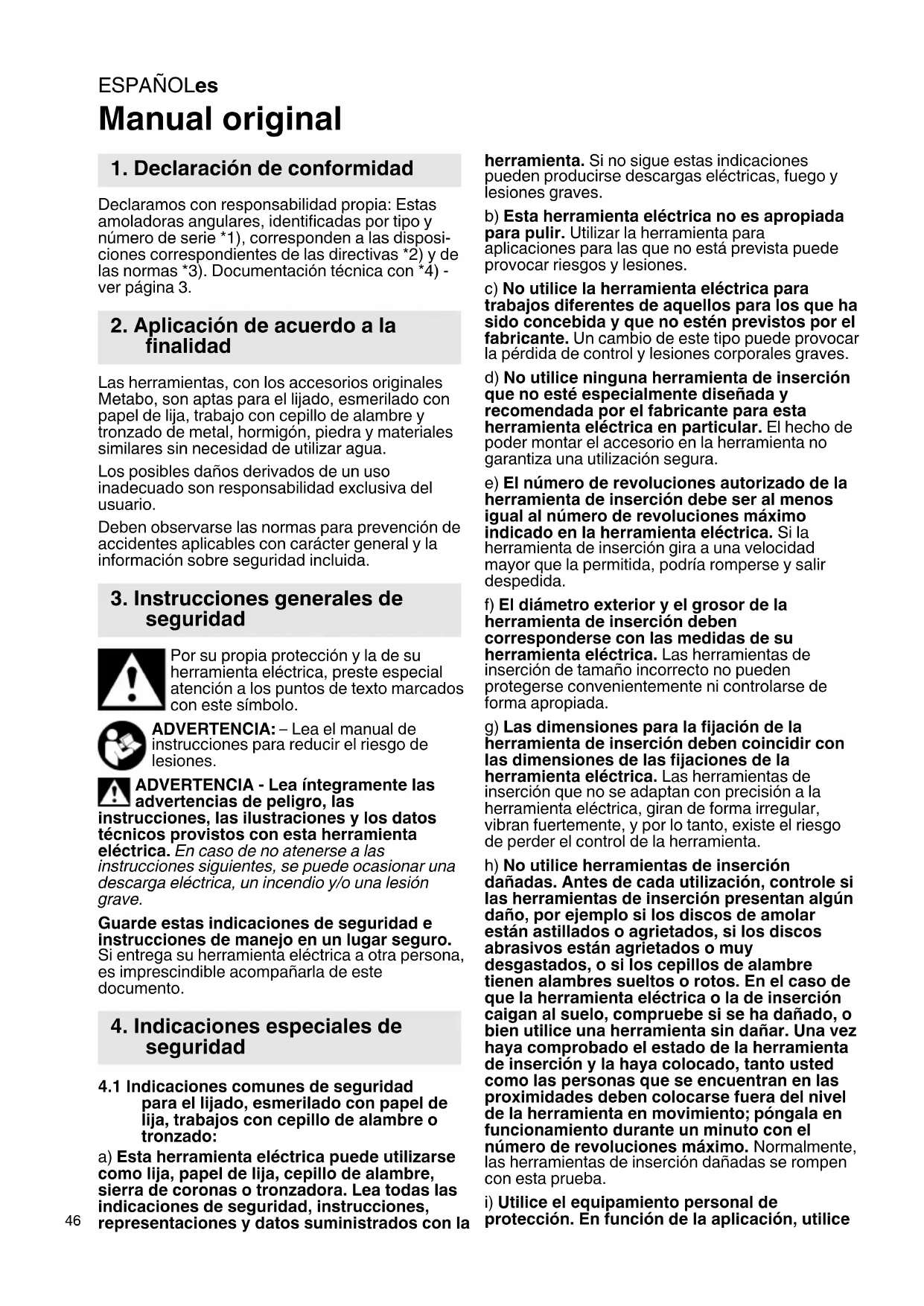 4.1 Indicaciones comunes de seguridad para el lijado, esmerilado con papel de lijia, problemas con cepillo de alambre o tronzado: