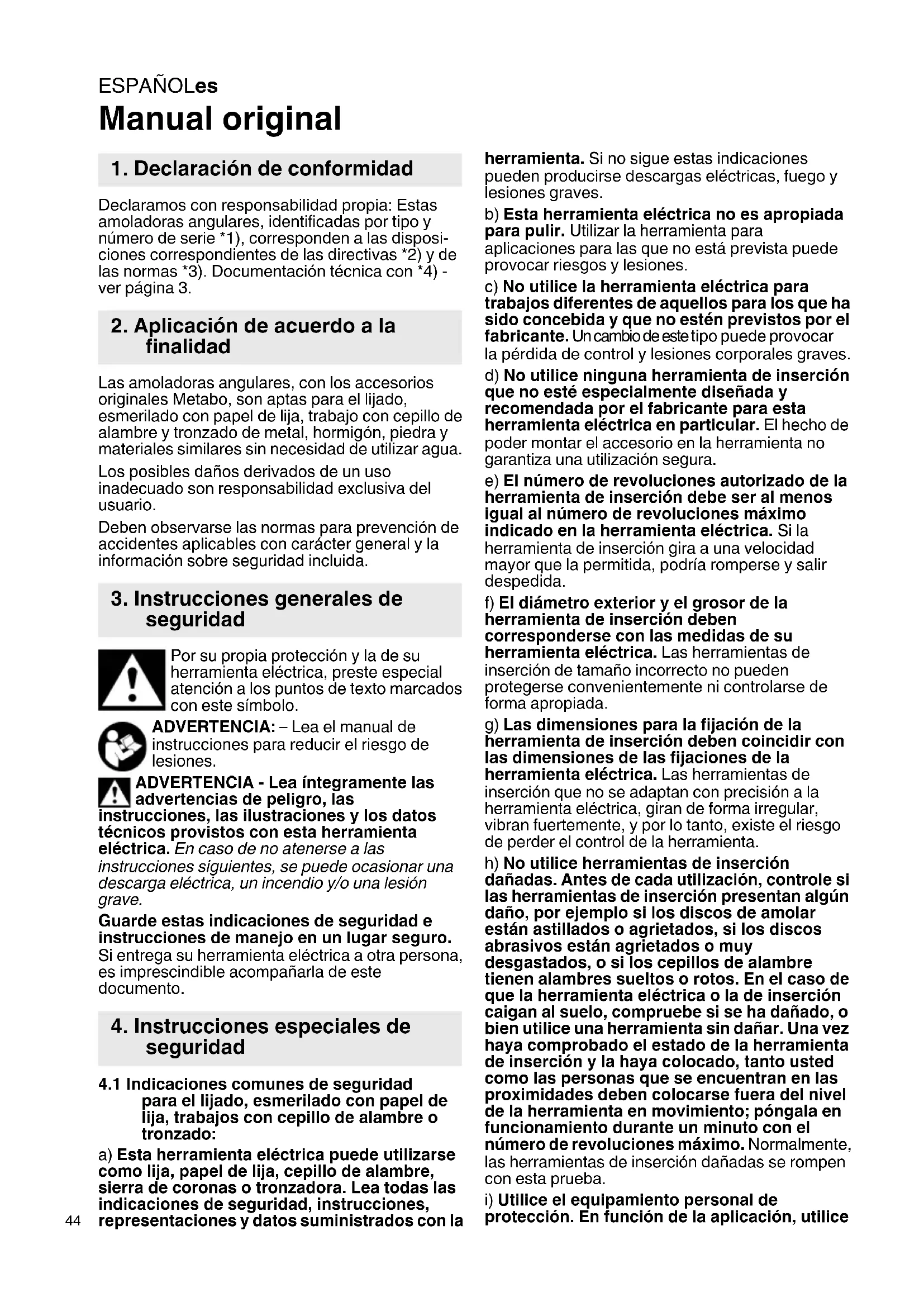 Manual original Declaramos con responsabilidad propia: Estas amoladoras angulares, identificadas por tipo y número de serie *1), corresponden a las disposi- ciones correspondientes de las directivas *2) y de las normas *3). Documentación técnica con *4) - ver página 3. Las amoladoras angulares, con los accesorios originales Metabo, son aptas para el lijado, esmerilado con papel de lija, trabajo con cepillo de alambre y tronzado de metal, hormigón, piedra y materiales similares sin necesidad de utilizar agua. Los posibles daños derivados de un uso inadecuado son responsabilidad exclusiva del usuario. Deben observarse las normas para prevención de accidentes aplicables con carácter general y la información sobre seguridad incluida. Por su propia protección y la de su herramienta eléctrica, preste especial atención a los puntos de texto marcados con este símbolo. ADVERTENCIA: – Lea el manual de instrucciones para reducir el riesgo de lesiones. ADVERTENCIA - Lea íntegramente las advertencias de peligro, las instrucciones, las ilustraciones y los datos técnicos provistos con esta herramienta eléctrica. En caso de no atenerse a las instrucciones siguientes, se puede ocasionar una descarga eléctrica, un incendio y/o una lesión grave. Guarde estas indicaciones de seguridad e instrucciones de manejo en un lugar seguro. Si entrega su herramienta eléctrica a otra persona, es imprescindible acompañarla de este documento.
