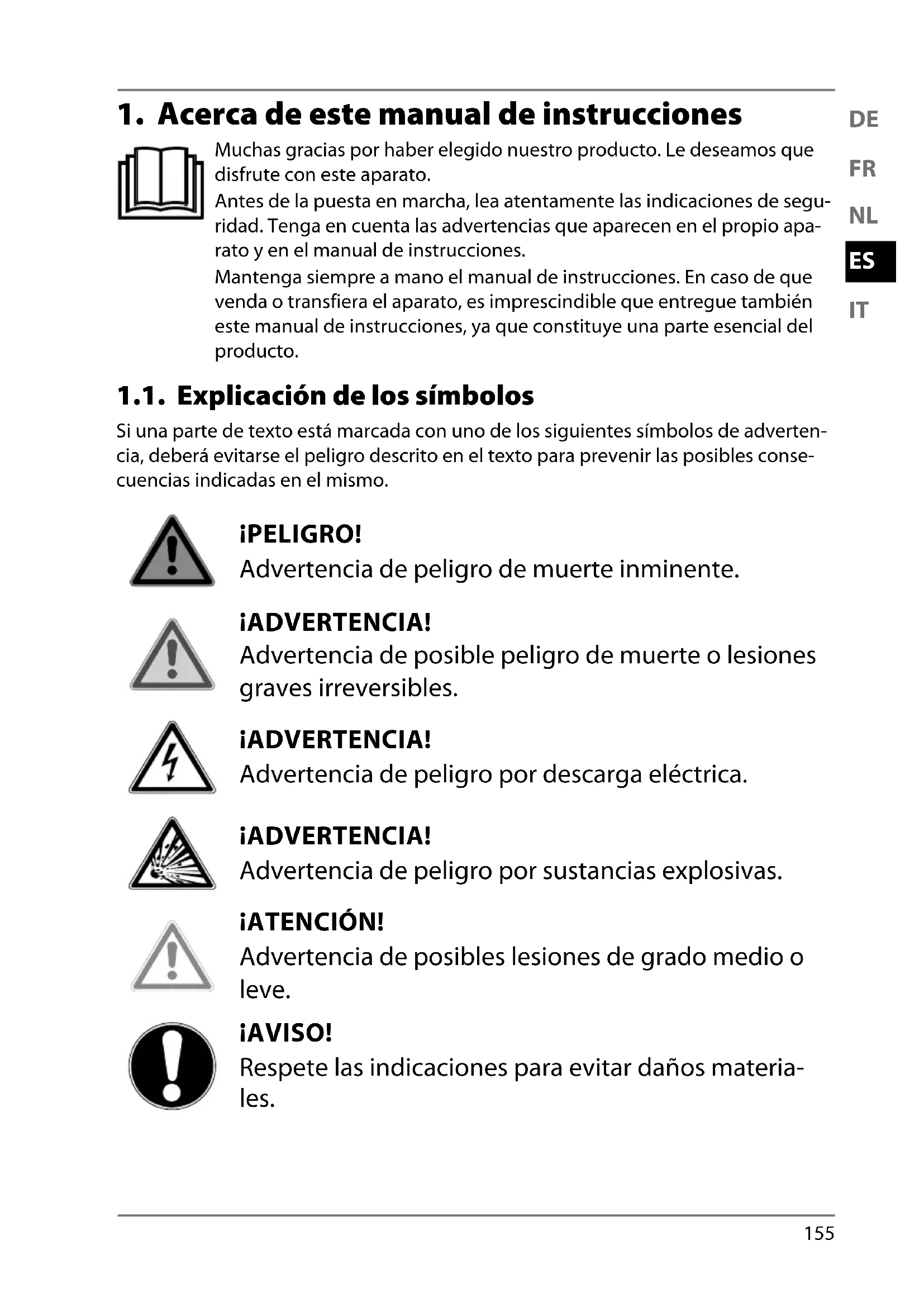 Muchas gracias por haber elegido nuestro producto. Le deseamos que disfrute con este aparato. Antes de la puesta en marcha, lea atentamente las indicaciones de segu- ridad. Tenga en cuenta las advertencias que aparecen en el propio apa- rato y en el manual de instrucciones. Mantenga siempre a mano el manual de instrucciones. En caso de que venda o transfiera el aparato, es imprescindible que entregue también este manual de instrucciones, ya que constituye una parte esencial del producto. 1.1. Explicación de los símbolos Si una parte de texto está marcada con uno de los siguientes símbolos de adverten- cia, deberá evitarse el peligro descrito en el texto para prevenir las posibles conse- cuencias indicadas en el mismo. PELIGRO! Advertencia de peligro de muerte inminente. ADVERTENCIA! Advertencia de posible peligro de muerte o lesiones graves irreversibles. ADVERTENCIA! Advertencia de peligro por descarga eléctrica. ADVERTENCIA! Advertencia de peligro por sustancias explosivas. ATENCIÓN! Advertencia de posibles lesiones de grado medio o leve. AVISO! Respete las indicaciones para evitar daños materia- les.156 Información más detallada para el uso del aparato. AVISO! Respete las indicaciones del manual de instrucciones.