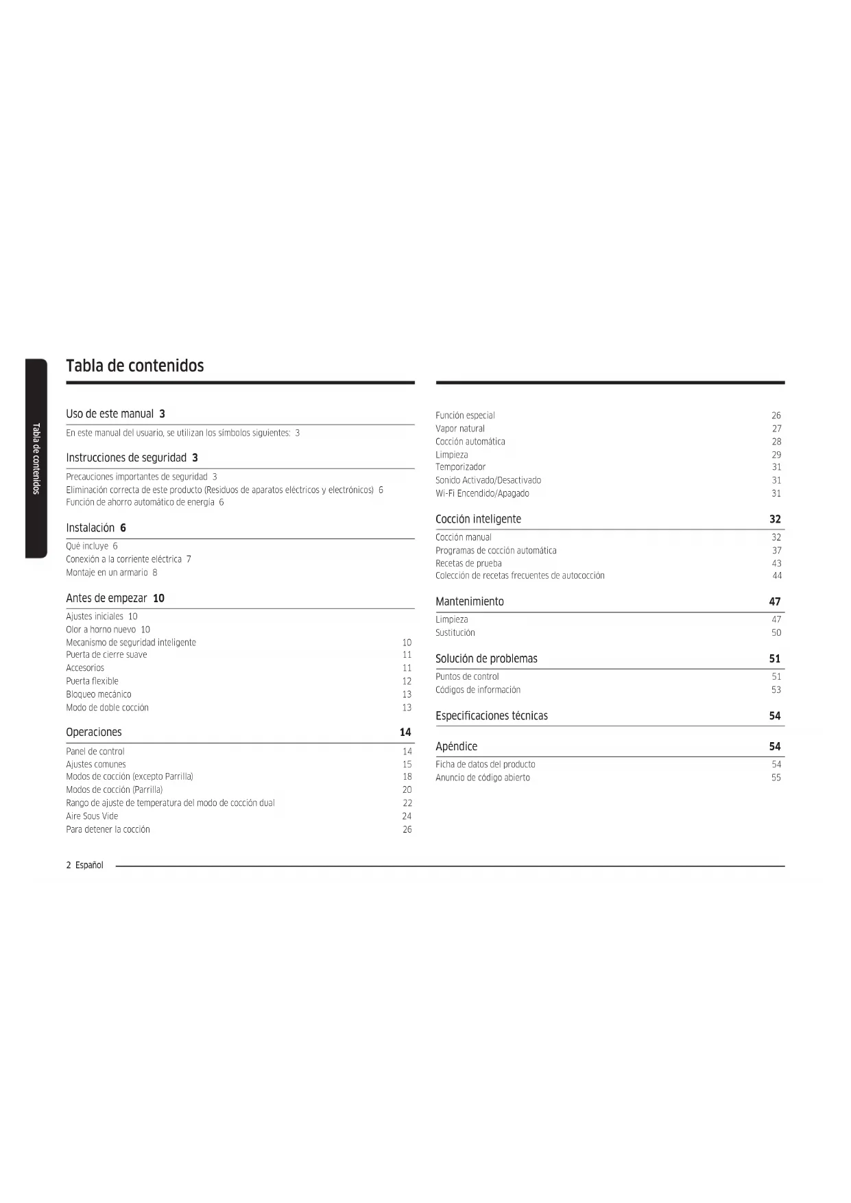 Horno empotrable Manual del usuario y de instalación NV7B441**** / NV7B442**** / NV7B443**** / NV7B444**** / NV7B445**** / NV7B441**C* / NV7B442**C* / NV7B444**C* / NV7B451**** / NV7B452**** / NV7B453**** / NV7B454**** / NV7B455****2 Español Tabla de contenidos Tabla de contenidos Uso de este manual 3 En este manual del usuario, se utilizan los símbolos siguientes: 3 Instrucciones de seguridad 3 Precauciones importantes de seguridad 3 Eliminación correcta de este producto (Residuos de aparatos eléctricos y electrónicos) 6 Función de ahorro automático de energía 6 Instalación 6 Qué incluye 6 Conexión a la corriente eléctrica 7 Montaje en un armario 8 Antes de empezar 10 Ajustes iniciales 10 Olor a horno nuevo 10 Mecanismo de seguridad inteligente 10 Puerta de cierre suave 11 Accesorios 11 Puerta exible 12 Bloqueo mecánico 13 Modo de doble cocción 13 Operaciones 14 Panel de control 14 Ajustes comunes 15 Modos de cocción (excepto Parrilla) 18 Modos de cocción (Parrilla) 20 Rango de ajuste de temperatura del modo de cocción dual 22 Aire Sous Vide 24 Para detener la cocción 26 Función especial 26 Vapor natural 27 Cocción automática 28 Limpieza 29 Temporizador 31 Sonido Activado/Desactivado 31 Wi-Fi Encendido/Apagado 31 Cocción inteligente 32 Cocción manual 32 Programas de cocción automática 37 Recetas de prueba 43 Colección de recetas frecuentes de autococción 44 Mantenimiento 47 Limpieza 47 Sustitución 50 Solución de problemas 51 Puntos de control 51 Códigos de información 53 Especicaciones técnicas 54 Apéndice 54 Ficha de datos del producto 54 Anuncio de código abierto 55Español 3 Uso de este manual Instrucciones de seguridad La instalación de este horno la debe realizar un técnico electricista autorizado. El instalador es el responsable de la conexión del electrodoméstico a la corriente eléctrica, de acuerdo con las recomendaciones de seguridad pertinentes. Precauciones importantes de seguridad ADVERTENCIA Este electrodoméstico no está pensado para que lo usen personas (incluidos los niños) con las discapacidades físicas, sensoriales o mentales, o faltas de experiencia y conocimientos, a menos que sean supervisadas o que hayan recibido instrucciones sobre el uso del electrodoméstico por parte de una persona responsable de su seguridad. No deje que los niños jueguen con el electrodoméstico. El medio de desconexión debe incorporarse en el cable jo de acuerdo con las normas de cableado. Tras la instalación, el electrodoméstico debe poder desconectarse de la fuente de alimentación. Para facilitar la desconexión, el enchufe debe estar accesible. También se puede montar un interruptor en el cable jo de acuerdo con las normas de cableado. Si el cable de alimentación está deteriorado, debe ser sustituido por el fabricante, un técnico de servicio autorizado o una persona igualmente cualicada a n de evitar incidentes. Uso de este manual Gracias por elegir un horno empotrable SAMSUNG. Este manual del usuario contiene información de seguridad importante e instrucciones cuyo propósito es ayudar al usuario a hacer funcionar y a realizar el mantenimiento del aparato. Antes de usar el horno, lea atentamente el presente manual del usuario y guárdelo para consultas posteriores. En este manual del usuario, se utilizan los símbolos siguientes: ADVERTENCIA Prácticas de riesgo o no seguras que pueden provocar lesiones personales graves, muerte o daños a la propiedad. PRECAUCIÓN Prácticas de riesgo o no seguras que pueden provocar lesiones personales o daños a la propiedad. NOTA Información, consejos y recomendaciones útiles que ayudan a los usuarios a utilizar el producto.4 Español Instrucciones de seguridad Instrucciones de seguridad El método de jación indicado no debe depender del uso de adhesivos, puesto que no se consideran un medio de jación able. Este electrodoméstico lo pueden utilizar niños mayores de 8 años y personas con discapacidades físicas, sensoriales o mentales, o faltas de experiencia y conocimiento, siempre que se les supervise o hayan recibido instrucciones sobre el uso seguro del electrodoméstico y comprendan los riesgos que conlleva. Los niños no deben jugar con el electrodoméstico. Los niños no deben limpiar ni hacer el mantenimiento del electrodoméstico sin vigilancia. Mantenga el electrodoméstico y el cable fuera del alcance de los niños menores de 8 años. El electrodoméstico se calienta durante su uso. Evite tocar los elementos calefactores del interior del horno. ADVERTENCIA: Las partes accesibles pueden calentarse durante el uso. No deje que los niños se acerquen. No use limpiadores abrasivos ni útiles metálicos alados para limpiar la puerta de cristal del horno, ya que pueden rayar la supercie y producir una rotura del cristal. Si el electrodoméstico tiene la función de limpieza, se han de eliminar los derrames antes y durante la limpieza con vapor o la autolimpieza, y no se deben dejar los utensilios dentro del horno. La función de limpieza depende del modelo. Si el electrodoméstico tiene la función de limpieza, durante las condiciones de limpieza las supercies pueden calentarse más de lo normal, por lo que se debe mantener a los niños alejados del horno. En el caso de los aparatos con proceso de limpieza pirolítica, algunos animales, en particular los pájaros, pueden ser sensibles a los humos y a las uctuaciones locales de temperatura durante el proceso de limpieza pirolítica, y deben ser trasladados a una zona adecuada y bien ventilada durante este proceso. Ventile la estancia durante y después del proceso de pirólisis. La función de limpieza depende del modelo. Utilice solo el medidor de temperatura recomendado para este horno. (Solo modelos con sonda para carne) No utilice un limpiador a vapor. ADVERTENCIA: Cuando vaya a reemplazar la lámpara, desenchufe el electrodoméstico de la corriente eléctrica para evitar cualquier riesgo de descarga eléctrica. El electrodoméstico no 
