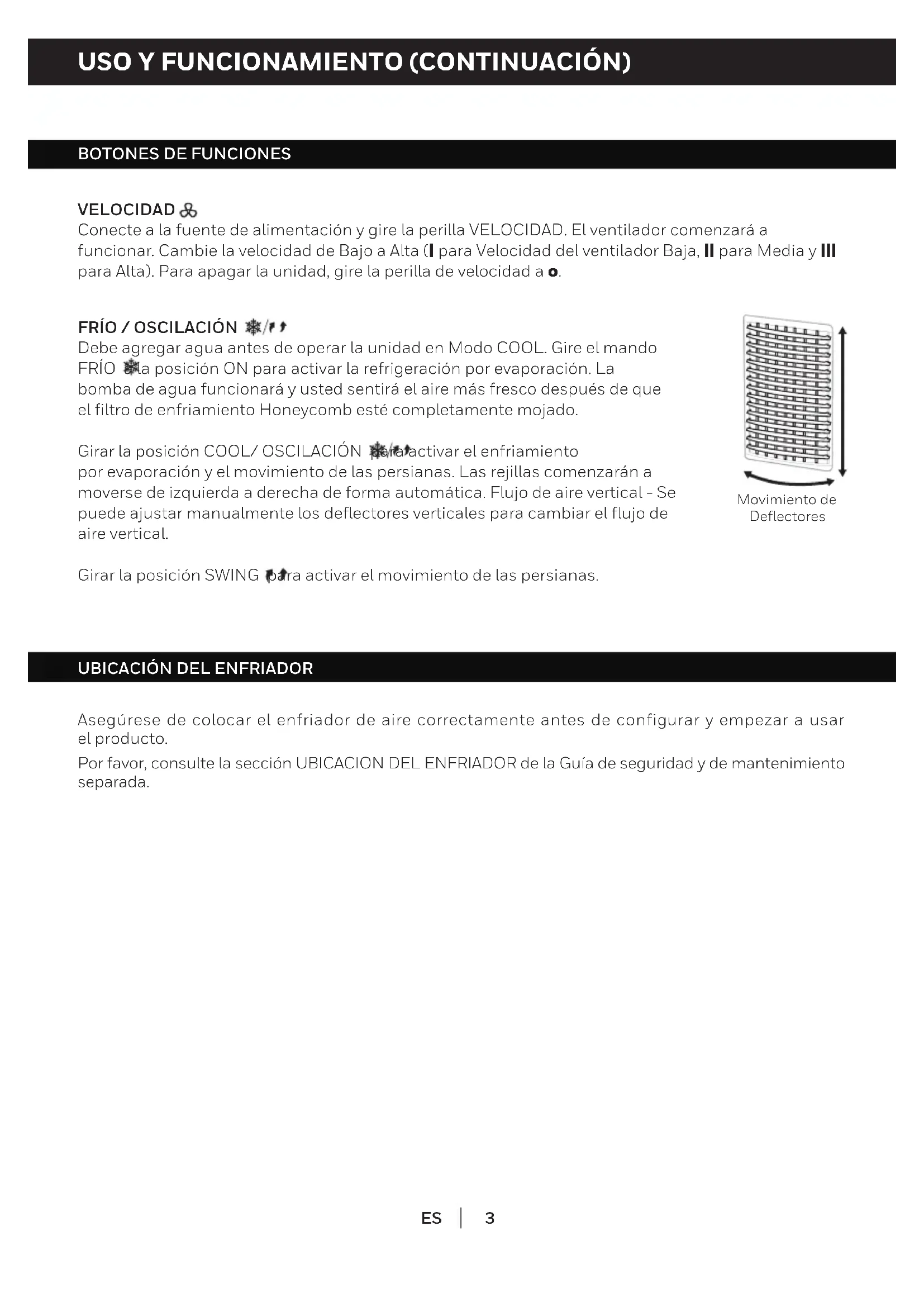 Debe agregar agua antes de operar la unidad en Modo COOL. Gire el mando FRÍO a la posición ON para activar la refrigeración por evaporación. La bomba de agua funcionará y usted sentirá el aire más fresco después de que el filtro de enfriamiento Honeycomb esté completamente mojado. Girar la posición COOL/ OSCILACIÓN para activar el enfriamiento por evaporación y el movimiento de las persianas. Las rejillas comenzarán a moverse de izquierda a derecha de forma automática. Flujo de aire vertical - Se puede ajustar manualmente los deflectores verticales para cambiar el flujo de aire vertical. Girar la posición SWING para activar el movimiento de las persianas. Asegúrese de colocar el enfriador de aire correctamente antes de configurar y empezar a usar el producto. Por favor, consulte la sección UBICACION DEL ENFRIADOR de la Guía de seguridad y de mantenimiento separada.