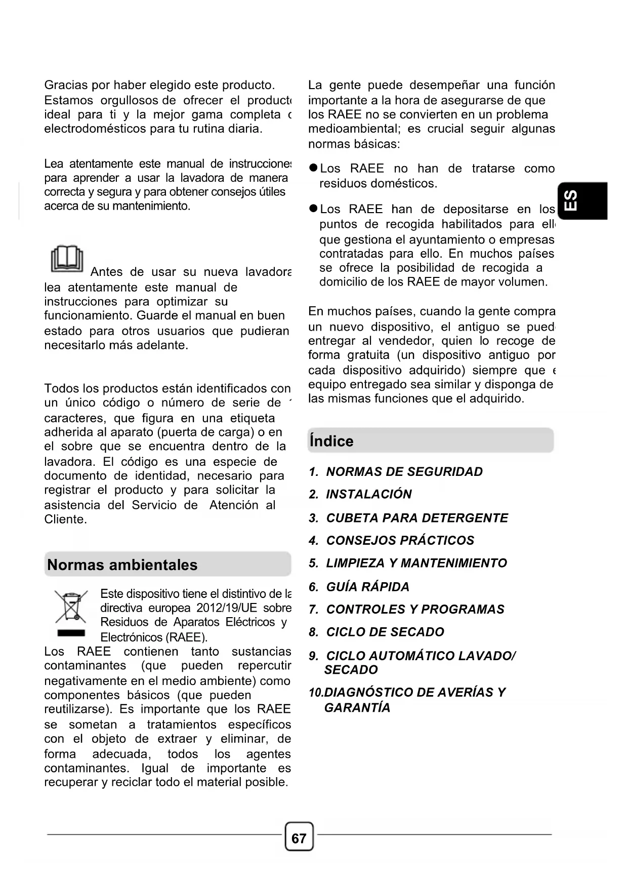 Gracias por haber elegido este producto. Estamos orgullosos de ofrecer el producto ideal para ti y la mejor gama completa de electrodomésticos para tu rutina diaria. Lea atentamente este manual de instrucciones para aprender a usar la lavadora de manera correcta y segura y para obtener consejos útiles acerca de su mantenimiento. Antes de usar su nueva lavadora, lea atentamente este manual de instrucciones para optimizar su funcionamiento. Guarde el manual en buen estado para otros usuarios que pudieran necesitarlo más adelante. Todos los productos están identificados con un único código o número de serie de 16 caracteres, que figura en una etiqueta adherida al aparato (puerta de carga) o en el sobre que se encuentra dentro de la lavadora. El código es una especie de documento de identidad, necesario para registrar el producto y para solicitar la asistencia del Servicio de Atención al Cliente.