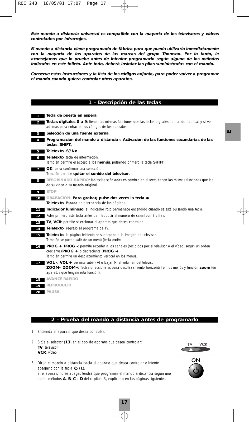 (televisor o vídeo). Remítase a la lista que se adjunta a este folleto, en la página II de los códigos. 1. Encienda el aparato que desea controlar. 2. Sitúe el selector (13) en el tipo de aparato que desea controlar: TV: televisor, VCR: vídeo 3. Mantenga pulsada la tecla SHIFT (4) hasta que el indicador rojo (11) permanezca encendido. El indicador permanecerá encendido unos segundos, de este modo tendrá tiempo para llevar a cabo el paso 4. El parpadeo del indicador indica el final del tiempo disponible, después se apaga. 4. Con el indicador encendido, teclee el primero de los códigos de 3 cifras propuestos para la marca del aparato que se quiere controlar (ej.: 016 para Thomson). El indicador rojo se apaga. El indicador parpadea si el código no está en la lista. 5. Dirija el mando a distancia hacia el aparato e intente apagarlo pulsando una vez en la tecla B (1). 6. Si el aparato no se apaga, repita la etapa 3. Teclee después el código de 3 cifras siguiente. Intente apagar el aparato pulsando una vez en la tecla B (1). Repetir la operación probando con cada uno de los códigos de 3 cifras. Comprobación de la programación: Su aparato está preparado, en principio, para recibir las órdenes del mando a distancia. Compruebe el funcionamiento llevando a cabo el test de la página 20.