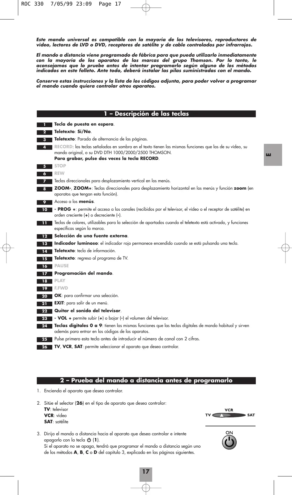 5 – Comprobación de la programación - Con un televisor o un receptor de satélite. pulse, por ejemplo, en 2 para cambiar de canal o para encender el aparato, si está apagado. - Con un vídeo: introduzca una cinta y pulse en PLAY. - Con un lector de DVD: inserte un disco y pulse en PLAY. Pruebe otras teclas del mando a distancia para conocer el alcance de las funciones que su mando a distancia puede controlar. Si considera que no todas las teclas están activas, pruebe otro método de programación, Método B o C. Cuando haya encontrado el código de su aparato, apúntelo por mayor comodidad si lo necesita en el futuro. Cuando cambie las pilas, tendrá que volver a programar el mando.