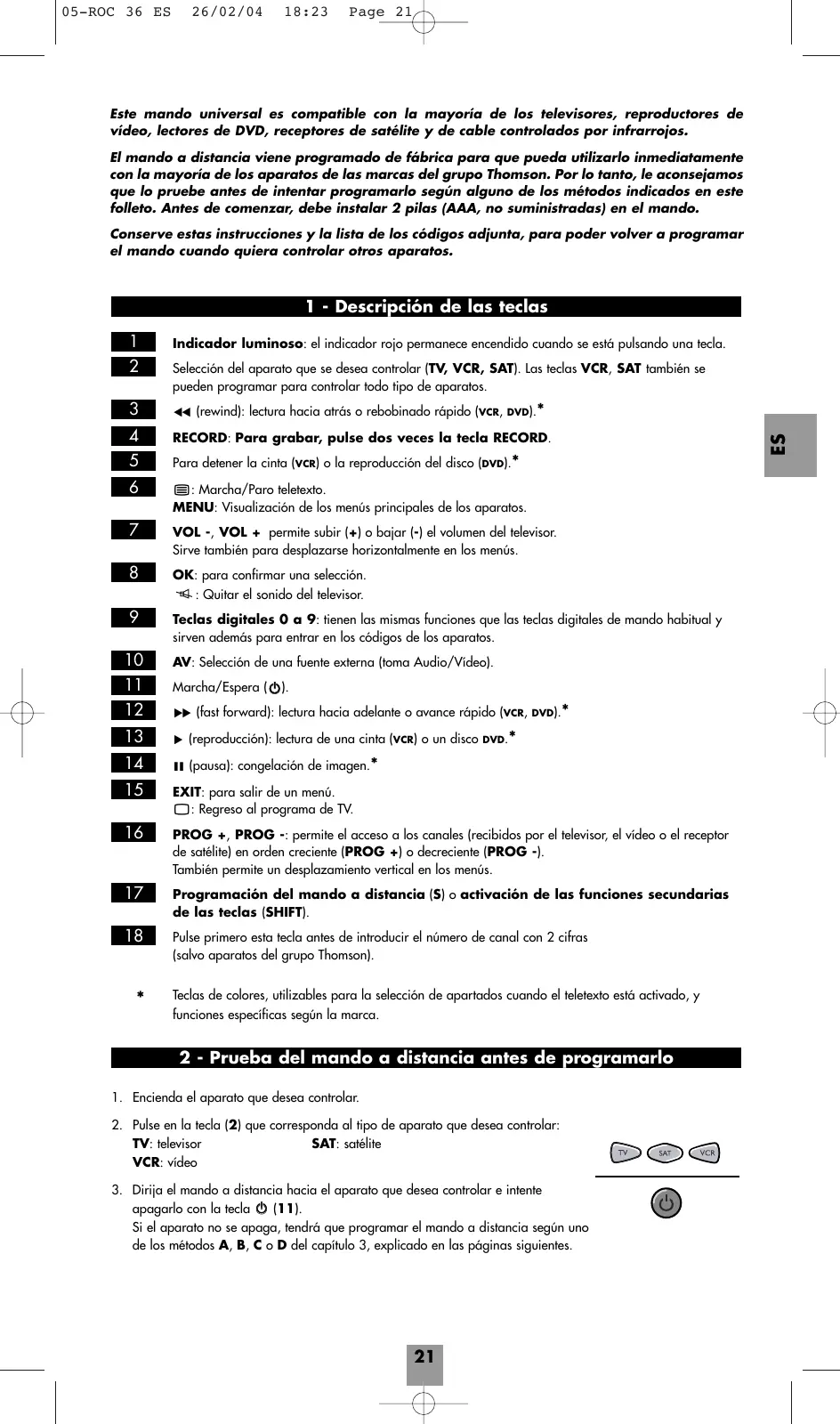 Remítase a la lista que se adjunta a este folleto, en la página I de los códigos. 1. Encienda el aparato que desea controlar. 2. Mantenga pulsada la tecla S (17) hasta que el indicador rojo (1) permanezca encendido (el indicador permanecerá encendido unos segundos, tiempo suficiente para realizar los siguientes pasos. El parpadeo del indicador indica el final del tiempo disponible, después se apaga). 3. Pulse en la tecla (2) que corresponda al tipo de aparato que desea controlar: TV: televisor, VCR: vídeo, SAT: satélite. 4. Mientras que el indicador está encendido, teclee el subcódigo (ej.: 1 para Thomson).