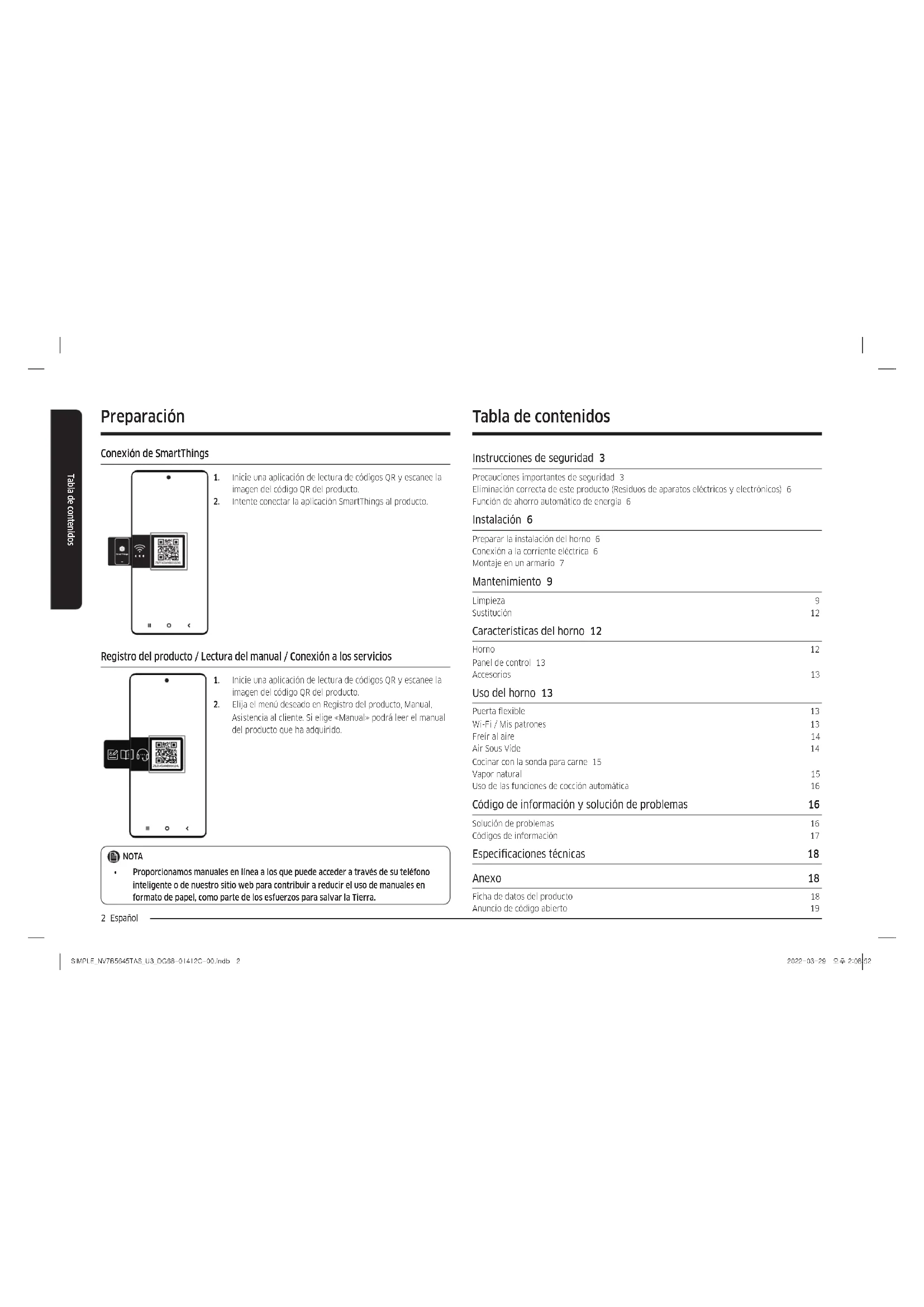 - Para consultar las instrucciones de uso del producto, consulte los manuales de usuario proporcionados como código QR o el sitio web de Samsung Electronics (https://www.samsung.com). Escanéelo con su teléfono inteligente. SIMPLE_NV7B5645TAS_U3_DG68-01412C-00.indb 1SIMPLE_NV7B5645TAS_U3_DG68-01412C-00.indb 1 2022-03-29 오후 2:08:522022-03-29 오후 2:08:522 Español Tabla de contenidos Tabla de contenidos Tabla de contenidos Instrucciones de seguridad 3 Precauciones importantes de seguridad 3 Eliminación correcta de este producto (Residuos de aparatos eléctricos y electrónicos) 6 Función de ahorro automático de energía 6 Instalación 6 Preparar la instalación del horno 6 Conexión a la corriente eléctrica 6 Montaje en un armario 7 Mantenimiento 9 Limpieza 9 Sustitución 12 Características del horno 12 Horno 12 Panel de control 13 Accesorios 13 Uso del horno 13 Puerta exible 13 Wi-Fi / Mis patrones 13 Freír al aire 14 Air Sous Vide 14 Cocinar con la sonda para carne 15 Vapor natural 15 Uso de las funciones de cocción automática 16 Código de información y solución de problemas 16 Solución de problemas 16 Códigos de información 17 Especicaciones técnicas 18 Anexo 18 Ficha de datos del producto 18 Anuncio de código abierto 19 Preparación Conexión de SmartThings