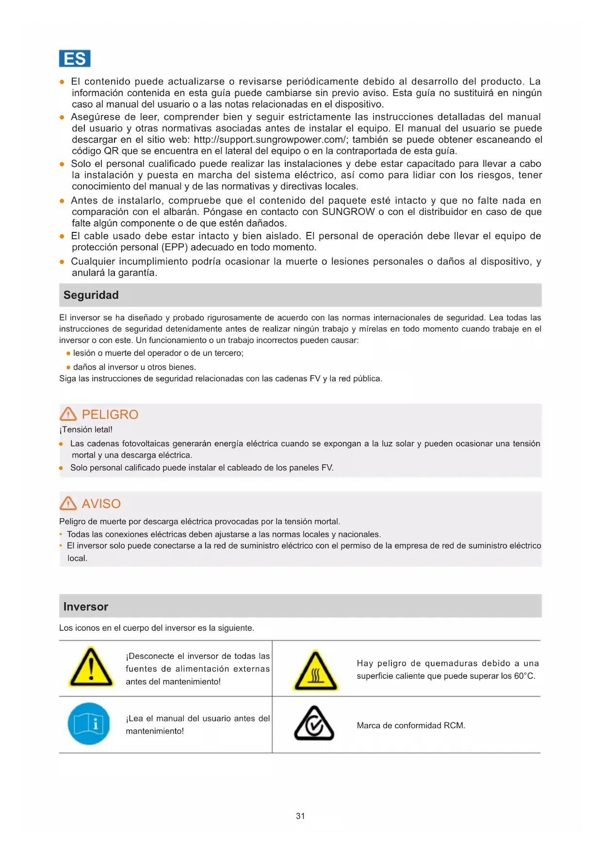 ● El contenido puede actualizarse o revisarse periódicamente debido al desarrollo del producto. La información contenida en esta guía puede cambiarse sin previo aviso. Esta guía no sustituirá en ningún caso al manual del usuario o a las notas relacionadas en el dispositivo. ● Asegúrese de leer, comprender bien y seguir estrictamente las instrucciones detalladas del manual del usuario y otras normativas asociadas antes de instalar el equipo. El manual del usuario se puede descargar en el sitio web: http://support.sungrowpower.com/; también se puede obtener escaneando el código QR que se encuentra en el lateral del equipo o en la contraportada de esta guía. ● Solo el personal cualicado puede realizar las instalaciones y debe estar capacitado para llevar a cabo la instalación y puesta en marcha del sistema eléctrico, así como para lidiar con los riesgos, tener conocimiento del manual y de las normativas y directivas locales. ● Antes de instalarlo, compruebe que el contenido del paquete esté intacto y que no falte nada en comparación con el albarán. Póngase en contacto con SUNGROW o con el distribuidor en caso de que falte algún componente o de que estén dañados. ● El cable usado debe estar intacto y bien aislado. El personal de operación debe llevar el equipo de protección personal (EPP) adecuado en todo momento. ● Cualquier incumplimiento podría ocasionar la muerte o lesiones personales o daños al dispositivo, y anulará la garantía. Seguridad El inversor se ha diseñado y probado rigurosamente de acuerdo con las normas internacionales de seguridad. Lea todas las instrucciones de seguridad detenidamente antes de realizar ningún trabajo y mírelas en todo momento cuando trabaje en el inversor o con este. Un funcionamiento o un trabajo incorrectos pueden causar: ● lesión o muerte del operador o de un tercero; ● daños al inversor u otros bienes. Siga las instrucciones de seguridad relacionadas con las cadenas FV y la red pública. PELIGRO ¡Tensión letal! ● Las cadenas fotovoltaicas generarán energía eléctrica cuando se expongan a la luz solar y pueden ocasionar una tensión mortal y una descarga eléctrica. ● Solo personal calicado puede instalar el cableado de los paneles FV. AVISO Peligro de muerte por descarga eléctrica provocadas por la tensión mortal.