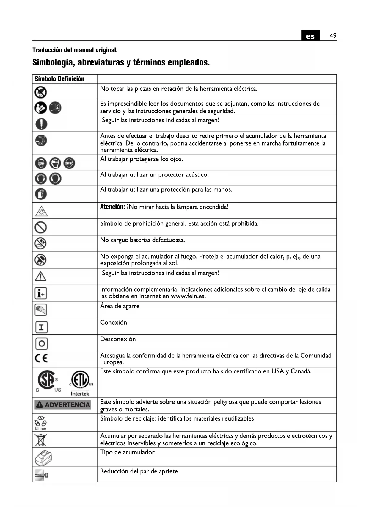 Traducción del manual original. Simbología, abreviaturas y términos empleados. Símbolo Definición No tocar las piezas en rotación de la herramienta eléctrica. Es imprescindible leer los documentos que se adjuntan, como las instrucciones de servicio y las instrucciones generales de seguridad. ¡Seguir las instrucciones indicadas al margen! Antes de efectuar el trabajo descrito retire primero el acumulador de la herramienta eléctrica. De lo contrario, podría accidentarse al ponerse en marcha fortuitamente la herramienta eléctrica. Al trabajar protegerse los ojos. Al trabajar utilizar un protector acústico. Al trabajar utilizar una protección para las manos. Atención: ¡No mirar hacia la lámpara encendida! Símbolo de prohibición general. Esta acción está prohibida. No cargue baterías defectuosas. No exponga el acumulador al fuego. Proteja el acumulador del calor, p. ej., de una exposición prolongada al sol. ¡Seguir las instrucciones indicadas al margen! Información complementaria: indicaciones adicionales sobre el cambio del eje de salida las obtiene en internet en www.fein.es. Área de agarre Conexión Desconexión Atestigua la conformidad de la herramienta eléctrica con las directivas de la Comunidad Europea. Este símbolo confirma que este producto ha sido certificado en USA y Canadá. Este símbolo advierte sobre una situación peligrosa que puede comportar lesiones graves o mortales. Símbolo de reciclaje: identifica los materiales reutilizables Acumular por separado las herramientas eléctricas y demás productos electrotécnicos y eléctricos inservibles y someterlos a un reciclaje ecológico. Tipo de acumulador Reducción del par de apriete ADVERTENCIA50