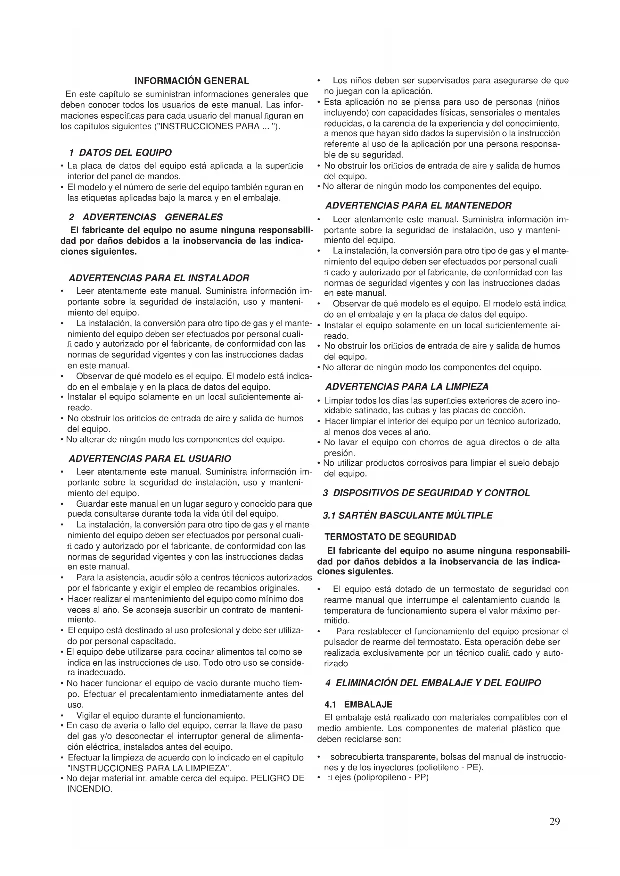 - El modelo y el número de serie del equipo también fi guran en las etiquetas aplicadas bajo la marca y en el embalaje. 2 ADVERTENCIAS GENERALES El fabricante del equipo no asume ninguna responsabili- dad por daños debidos a la inobservancia de las indica- ciones siguientes.