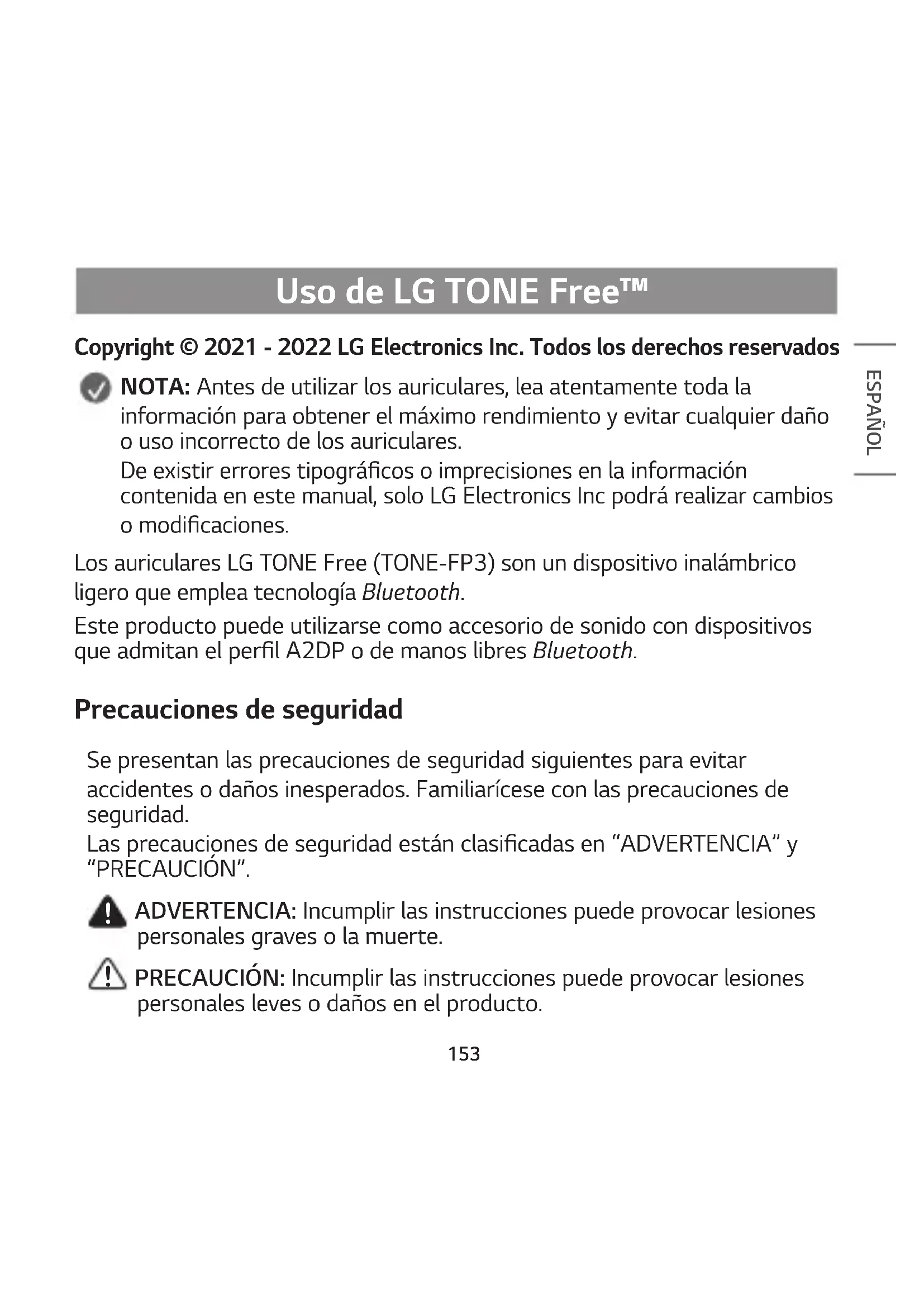 Copyright © 2021 - 2022 LG Electronics Inc. Todos los derechos reservados NOTA: Antes de utilizar los auriculares, lea atentamente toda la información para obtener el máximo rendimiento y evitar cualquier daño o uso incorrecto de los auriculares. De existir errores tipográcos o imprecisiones en la información contenida en este manual, solo LG Electronics Inc podrá realizar cambios o modicaciones. Los auriculares LG TONE Free (TONE-FP3) son un dispositivo inalámbrico ligero que emplea tecnología Bluetooth. Este producto puede utilizarse como accesorio de sonido con dispositivos que admitan el perl A2DP o de manos libres Bluetooth. Precauciones de seguridad Se presentan las precauciones de seguridad siguientes para evitar accidentes o daños inesperados. Familiarícese con las precauciones de seguridad. Las precauciones de seguridad están clasicadas en “ADVERTENCIA” y “PRECAUCIÓN”.