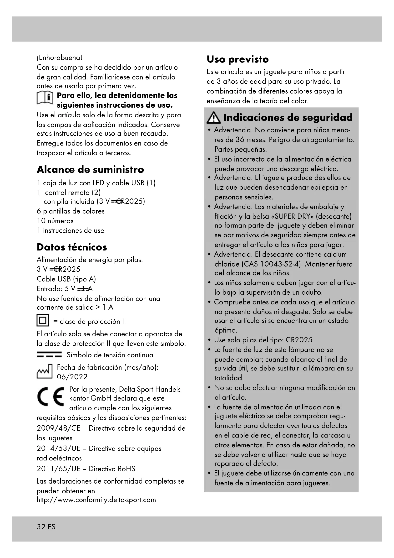 - DEMO (2l): pulse el botón para recibir una demostración de los distintos modos de luz. Juego El objetivo del juego es colocar las diferentes plantillas de colores encima del artículo (1) encendido y observar los cambios que se producen en función de la intensidad/del ritmo de la luz y la combinación de colores. Con los números de color se combina y se experimenta de manera lúdica la comprensión de los núme- ros y los colores. Almacenamiento, limpieza Si no va a utilizarlo, almacene siempre el artículo seco y limpio, sin pilas y a temperatura ambiente. Límpielo únicamente pasando un paño de limpieza seco. ¡IMPORTANTE! No lo limpie con productos de limpieza agresivos. Utilice la cuerda de transporte (1c) para trans- portar el artículo. Indicaciones para la eliminación Cuando ya no se pueda volver a usar, no deseche el artículo con la basura doméstica, sino que, por el bien del medio ambiente, elimínelo de forma correcta. Puede informarse acerca de los centros de recogida y sus horarios de apertura en una administración competente. Las pilas/acumuladores se deben reciclar de conformidad con la directiva 2006/66/EG y sus enmiendas. Deseche las pilas/acumuladores o el artículo en las instalaciones de recogida disponibles. Los materiales de embalaje, como bolsas de plástico, no se deben dejar en manos de los niños. Conserve el material de embalaje fuera del alcance de los niños. Daños medioambientales por la eliminación incorrecta de pilas/ acumuladores. No deseche las pilas/ acumuladores con la basura doméstica. Pueden contener metales pesados y deben ser tratados como residuos especiales. Los símbolos químicos de los metales pesados son estos: Cd = cadmio, Hg = mercurio, Pb = plomo. Por ello, elimine las pilas/acumuladores en un punto de recogida comunitario. Deseche el artículo y el embalaje de manera respetuosa con el medio ambiente. Al separar los residuos, tenga en cuenta la marcación de los materiales de embalaje, que se indica con abreviatu- ras (a) y números (b) que significan lo siguiente: 1-7: plásticos/20-22: papel y cartón/80-98: materiales compuestos. El artículo y su material de embalaje son reci- clables, deséchelos separados para un mejor tratamiento de los residuos. El logo «Triman» solo se aplica en Francia. Para más información sobre la eliminación del artículo, acuda a su ayuntamiento o a las autoridades municipales.35 Indicaciones relativas a la garantía y la gestión de servicios El artículo ha sido fabricado con gran esmero y sometido a controles constantes. Para el mismo, DELTA-SPORT HANDELSKONTOR GmbH ofrece a los clientes finales particulares una garantía de tres años a contar desde la fecha de compra (periodo de garantía) con arreglo a las condiciones que se exponen a continuación. La garantía tiene validez únicamente para fallos del material y fabricación. La garantía no cubre las piezas sometidas a un desgaste normal, las cuales se consideran piezas de desgaste (p. ej., pilas) así como tampoco piezas frágiles como, p. ej., interruptores, baterías o piezas fabricadas en vidrio o cristal. Se excluyen derechos derivados de esta garantía, si se ha realizado un uso incorrecto o abusivo del artículo o que no se encuentre dentro del marco del uso o ámbito de uso previs- tos o si no se ha observado lo recogido en el manual de instrucciones, a no ser que el cliente final demuestre que existen fallos del material o fabricación no derivados de una de las circuns- tancias expuestas anteriormente. Las demandas derivadas de la garantía sólo podrán presentarse dentro del periodo de garantía exhibiendo el comprobante de compra original. Le rogamos, por ello, que conserve el comprobante de compra original. El periodo de garantía no se verá prolongado por ningún tipo de reparación realizada con motivo de la ga- rantía, la garantía legal o como gesto de buena voluntad. Esto se aplica también a las piezas sustituidas o reparadas. Por favor, dirija sus quejas primero a la línea telefónica del servicio de atención al cliente que se indica a continuación o póngase en contacto con nosotros por correo electrónico. Si el caso está cubierto por la garantía, a nuestra elección, repararemos o cambiaremos gratuitamente el artículo o le restituiremos el precio de compra del mismo. De la garantía no se derivan otros derechos. Esta garantía no limitará sus derechos legales, especialmente los derechos de garantía frente al vendedor correspondiente. IAN: 389693_2201 Servicio España Tel.: 900 984 989 E-Mail: deltasport@lidl.es ES36 Hjertelig tillykke! Du har valgt at købe et kvalitetsprodukt. Lær pro- duktet at kende, inden du bruger det første gang. Det gør du ved at læse nedenståen- de brugervejledning omhyggeligt. Brug kun produktet som beskrevet og til de angivne anvendelsesområder. Opbevar denne brugervejledning et sikkert sted. Udlever også alle dokumenter, hvis produktet videregives til en tredjepart. Leveringsomfang 1 x lyskasse inkl. LED’er og USB-kabel (1) 1 x fjernbetjening (2) inkl. batteri (3 V CR2025) 6 x farveskabelon 10 x tal 1 x brugervejledning Tekniske data Strømforsyning, batteri: 3 V CR2025 USB-kabel (type A) Indgang: 5 V 1 A Anvend ikke strømforsyninger med en udgangsstrøm > 1 A = beskyttelsesklasse II Denne artikel må kun sluttes til apparater med beskyttelsesklasse II, der er mærket med dette symbol. Symbol for jævnspænding Fremstillingsdato (måned/år): 06/2022 Hermed erklærer Delta-Sport Handelskontor GmbH, at denne artikel er i overensstemmelse med følgende grundlæggende krav og de øvrige gældende bestemmelser: 2009/48/EU – legetøjsdirektiv 2014/53/EU – RED-direktiv 2011/65/EU – RoHS-direktiv De fuldstændige overensstemmelseserklæringer findes på: http://www.conformity.delta-sport.com Bestemmelsesmæssig brug Denne artikel er legetøj beregnet til børn fra 3 år til privat brug. Kombinationen af forskellige farver understøtter formidlingen af farvelære