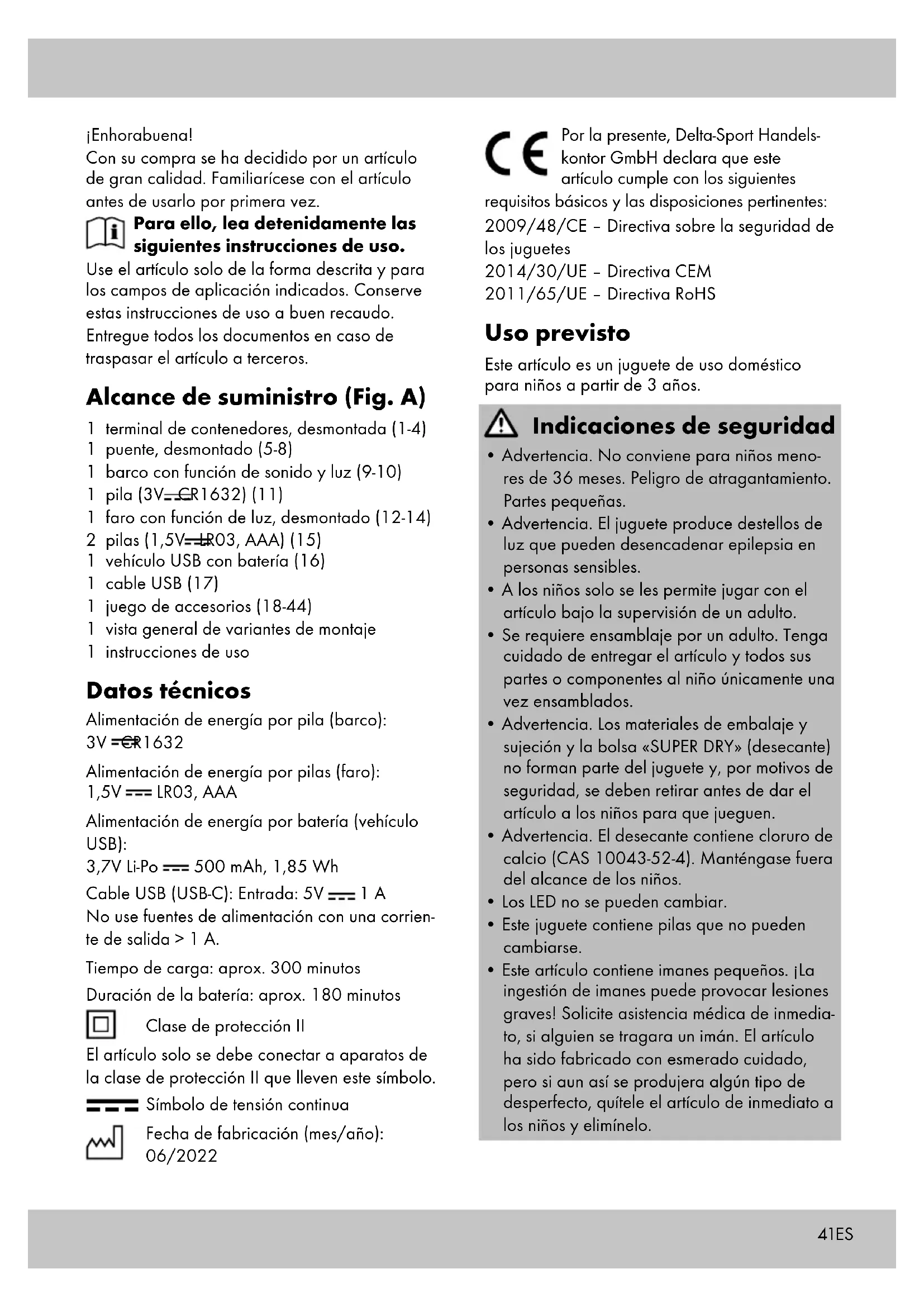 - Pulse el botón (16c) para mover el vehículo en marcha atrás. ¡Advertencia! El vehículo no está diseñado para ir marcha atrás en puentes o pendientes. Nota: El vehículo está apagado cuando la pestaña de control (16d) está en OFF.44 ES Tecnología de reconocimiento de colores Monte las plaquitas de color (44) en los carriles para utilizar la tecnología de reconocimiento de colores (Fig. L). Nota: Las plaquitas de color solo se pueden posicionar en carriles rectos. Cuando el vehículo (16) pasa por una plaquita de color, se controla en función del color: Color Reacción Lila El vehículo se detiene brevemente Azul Se emite el sonido Roja Cambia el estado de la luz (encendida/apagada) Verde Cambio de la dirección de marcha Almacenamiento, limpieza Si no va a utilizarlo, almacene siempre el artículo seco y limpio, sin pilas y a temperatura ambiente. Limpie solo con un paño de limpieza húmedo y después seque frotándolo. Advertencia: ¡Los carriles se deberían limpiar antes del primer uso! ¡IMPORTANTE! No lo limpie con productos de limpieza agresivos. Indicaciones para la eliminación Este símbolo indica que el dispositivo está sujeto a la Directiva 2012/19/UE. Esta directiva especifica que este disposi- tivo no puede ser eliminado con la basura doméstica normal al final de su vida útil, sino que debe ser entregado en puntos de recogida, centros de reciclaje o empresas eliminadoras de basura especialmente habilitados al efecto. Proteja el medio ambiente y elimine los productos correctamente. No deseche las pilas/acumuladores con la basura doméstica. Pueden contener metales pesados y deben ser tratados como residuos especiales. Los símbolos químicos de los metales pesa- dos son estos: Cd = cadmio, Hg = mercurio, Pb = plomo. Por ello, elimine las pilas/acumula- dores en un punto de recogida comunitario. En su administración local o municipal podrán informarle sobre otras posibilida- des de eliminación del artículo usado. No deje material de embalaje, como bolsas de plástico, en manos de niños. Guarde el material de embalaje en un lugar inaccesible para éstos. Al separar los residuos, tenga en cuenta la marcación de los materiales de embalaje, que se indica con abreviatu- ras (a) y números (b) que significan lo siguiente: 1-7: plásticos / 20-22: papel y cartón / 80-98: materiales compuestos. El artículo y su material de embalaje son reci- clables, deséchelos separados para un mejor tratamiento de los residuos. El logo «Triman» solo se aplica en Francia. Indicaciones relativas a la garantía y la gestión de ser- vicios El artículo ha sido fabricado con gran esmero y sometido a controles constantes. Para el mismo, DELTA-SPORT HANDELSKONTOR GmbH ofrece a los clientes finales particulares una garantía de tres años a contar desde la fecha de compra (periodo de garantía) con arreglo a las condiciones que se exponen a continuación. La garantía tiene validez únicamente para fallos del material y fabricación. La garantía no cubre las piezas sometidas a un desgaste normal, las cuales se consideran piezas de desgaste (p. ej., pilas) así como tampoco piezas frágiles como, p. ej., interruptores, baterías o piezas fabricadas en vidrio o cristal. Se excluyen derechos derivados de esta garantía, si se ha realizado un uso incorrecto o abusivo del artículo o que no se encuentre dentro del marco del uso o ámbito de uso previs- tos o si no se ha observado lo recogido en el manual de instrucciones, a no ser que el cliente final demuestre que existen fallos del material o fabricación no derivados de una de las circuns- tancias expuestas anteriormente.45ES Las demandas derivadas de la garantía sólo podrán presentarse dentro del periodo de garantía exhibiendo el comprobante de compra original. Le rogamos, por ello, que conserve el comprobante de compra original. El periodo de garantía no se verá prolongado por ningún tipo de reparación realizada con motivo de la ga- rantía, la garantía legal o como gesto de buena voluntad. Esto se aplica también a las piezas sustituidas o reparadas. Por favor, dirija sus quejas primero a la línea telefónica del servicio de atención al cliente que se indica a continuación o póngase en contacto con nosotros por correo electrónico. Si el caso está cubierto por la garantía, a nuestra elección, repararemos o cambiaremos gratuitamente el artículo o le restituiremos el precio de compra del mismo. De la garantía no se derivan otros derechos. Esta garantía no limitará sus derechos legales, especialmente los derechos de garantía frente al vendedor correspondiente. IAN: 397849_2201 Servicio España Tel.: 900 984 989 E-Mail: deltasport@lidl.es46 DK Hjertelig tillykke! Du har valgt at købe et kvalitetsprodukt. Lær pro- duktet at kende, inden du bruger det første gang. Det gør du ved at læse nedenstående brugervejledning omhyggeligt. Brug kun produktet som beskrevet og til de angivne anvendelsesområder. Opbevar denne brugervejledning et sikkert sted. Udlever også alle dokumenter, hvis produktet videregives til en tredjepart. Leveringsomfang (fig. A) 1 x containerterminal, adskilt (1-4) 1 x bro, adskilt (5-8) 1 x skib med lyd- og lysfunktion (9-10) 1 x batteri (3V CR1632) (11) 1 x fyrtårn med lysfunktion, adskilt (12-14) 2 x batteri (1,5V LR03, AAA) (15) 1 x USB-lokomotiv inkl. genopladeligt batteri (16) 1 x USB-kabel (17) 1 x tilbehør (18-44) 1 x oversigt over opbygningsvarianter 1 x brugervejledning Tekniske data Strømforsyning, batteri (skib): 3V CR1632 Strømforsyning, batteri (fyrtårn): 1,5V LR03, AAA Strømforsyning, genopladeligt batteri (USB-lokomotiv): 3,7V Li-Po 500 mAh, 1,85 Wh USB-kabel (USB-C): indgang: 5V 1 A Anvend ikke strømforsyninger med en udgangsstrøm >1 A. Ladetid: ca. 300 minutter Batteritid: ca. 180 minutter Beskyttelsesklasse II Denne artikel må kun sluttes til apparater med beskyttelsesklasse II, der er mærket med dette symbol. Symbol for jævnspænding Fremstillingsdato (må