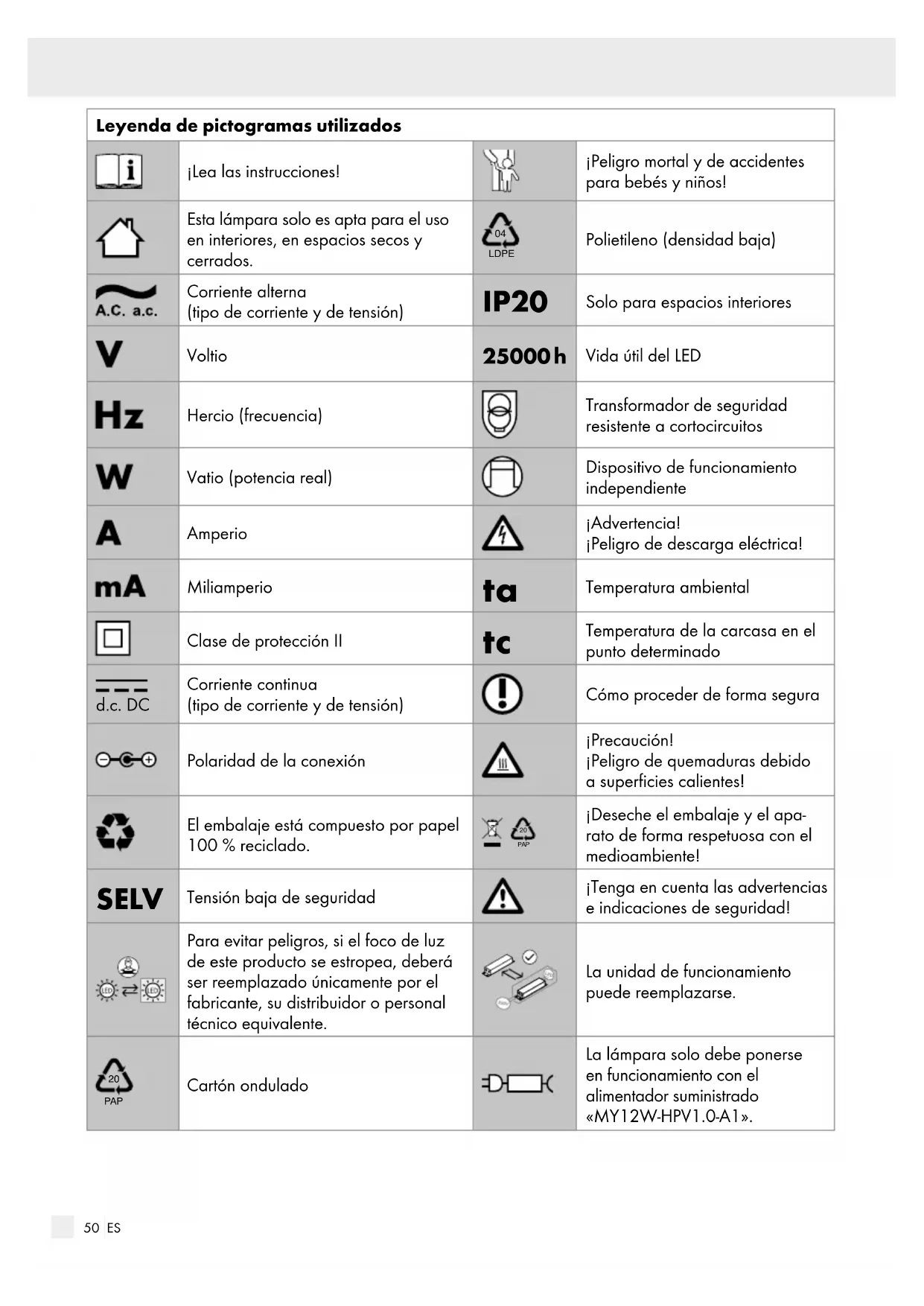 PAP ¡Deseche el embalaje y el apa- rato de forma respetuosa con el medioambiente! SELV Tensión baja de seguridad ¡Tenga en cuenta las advertencias e indicaciones de seguridad! Para evitar peligros, si el foco de luz de este producto se estropea, deberá ser reemplazado únicamente por el fabricante, su distribuidor o personal técnico equivalente. La unidad de funcionamiento puede reemplazarse.